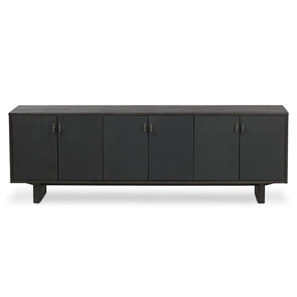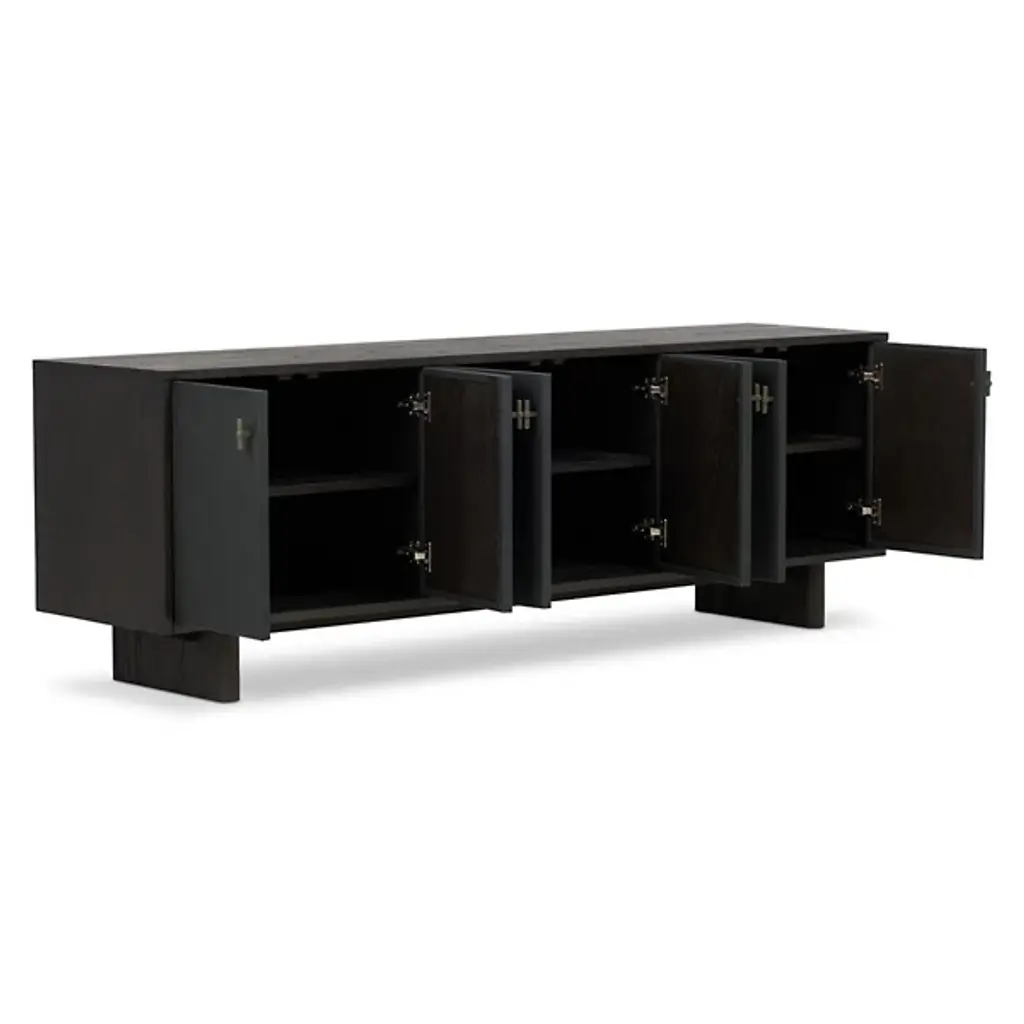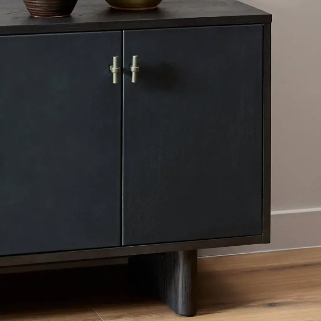 The Posada Media Console from Four Hands introduces Brazilian-made top-grain leather into traditional furniture design. The door fronts showcase exceptional craftsmanship with their leather overlay, creating an unexpected material contrast against the worn oak structure. Inset legs maintain the piece's streamlined profile, while integrated cord cutouts simplify device management. The interior shelving maximizes storage potential for media components and everyday items. This console honors traditional woodworking while incorporating modern conveniences, making it an ideal centerpiece for entertainment spaces or living rooms.