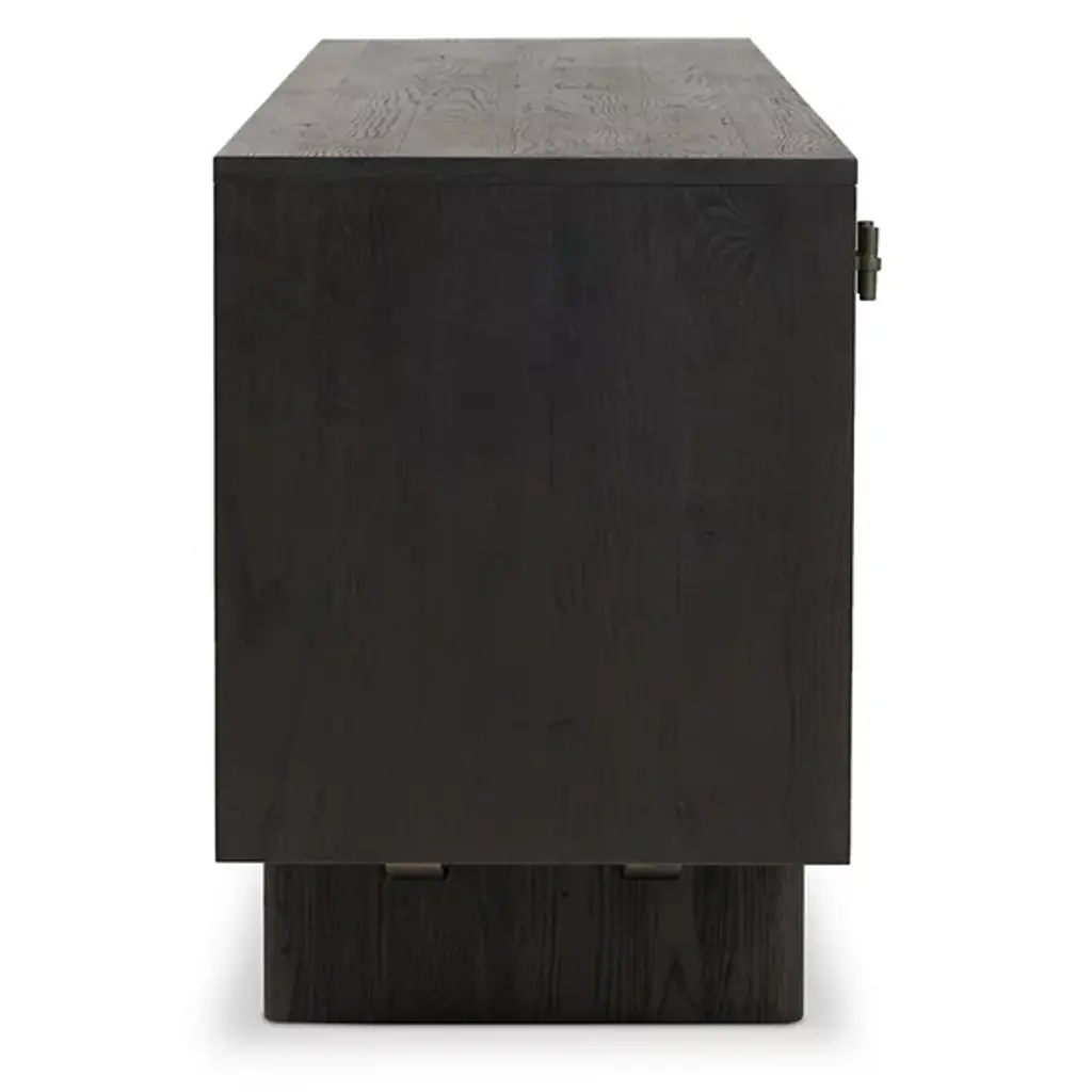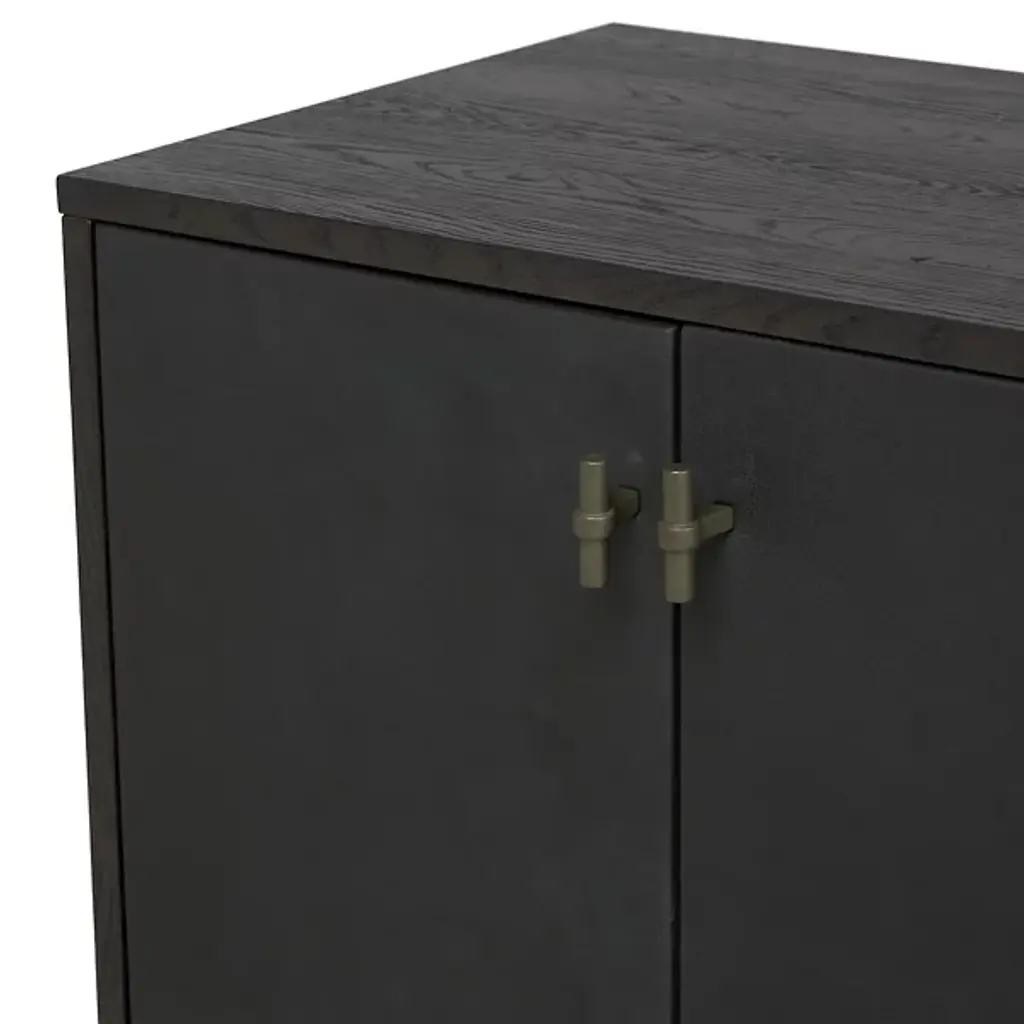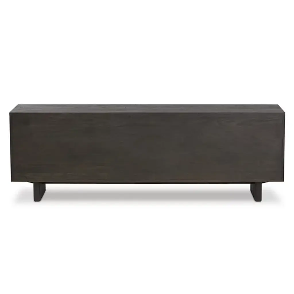 The Posada Media Console from Four Hands introduces Brazilian-made top-grain leather into traditional furniture design. The door fronts showcase exceptional craftsmanship with their leather overlay, creating an unexpected material contrast against the worn oak structure. Inset legs maintain the piece's streamlined profile, while integrated cord cutouts simplify device management. The interior shelving maximizes storage potential for media components and everyday items. This console honors traditional woodworking while incorporating modern conveniences, making it an ideal centerpiece for entertainment spaces or living rooms.