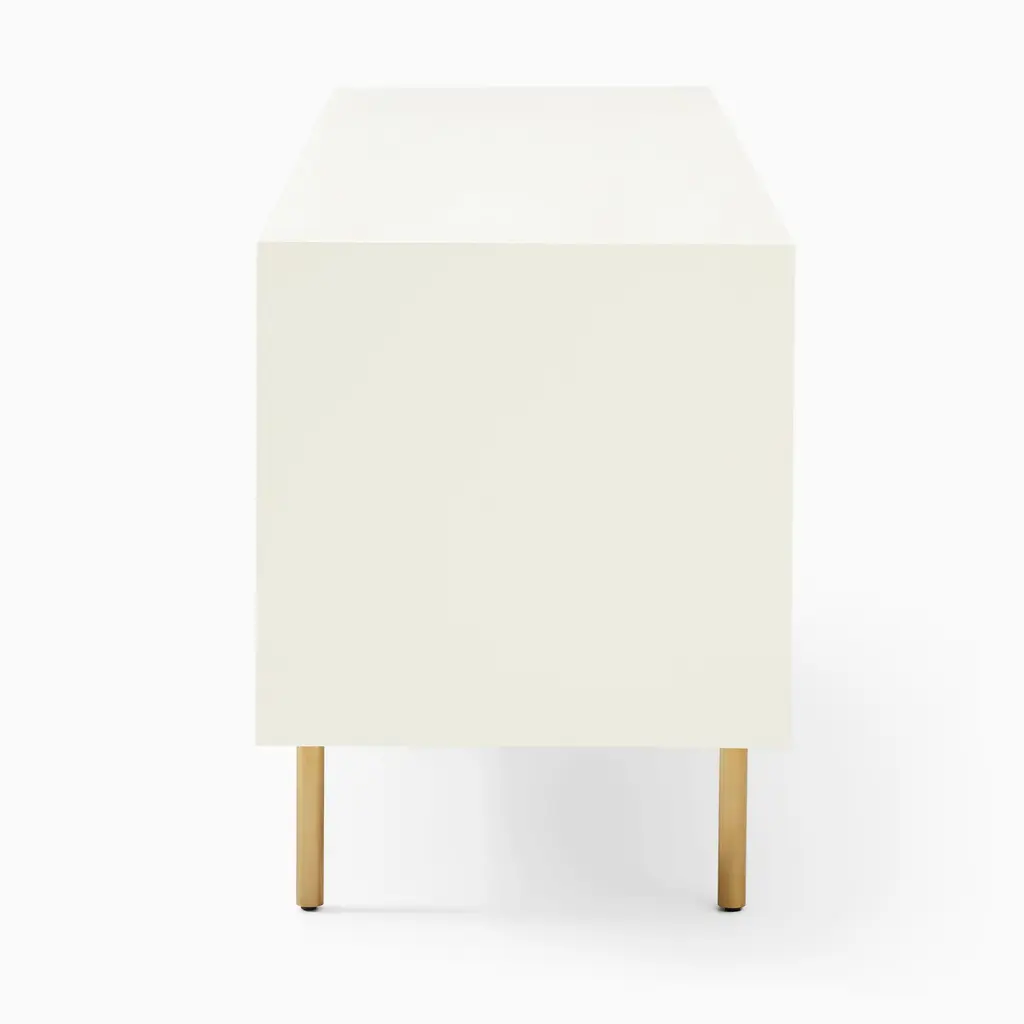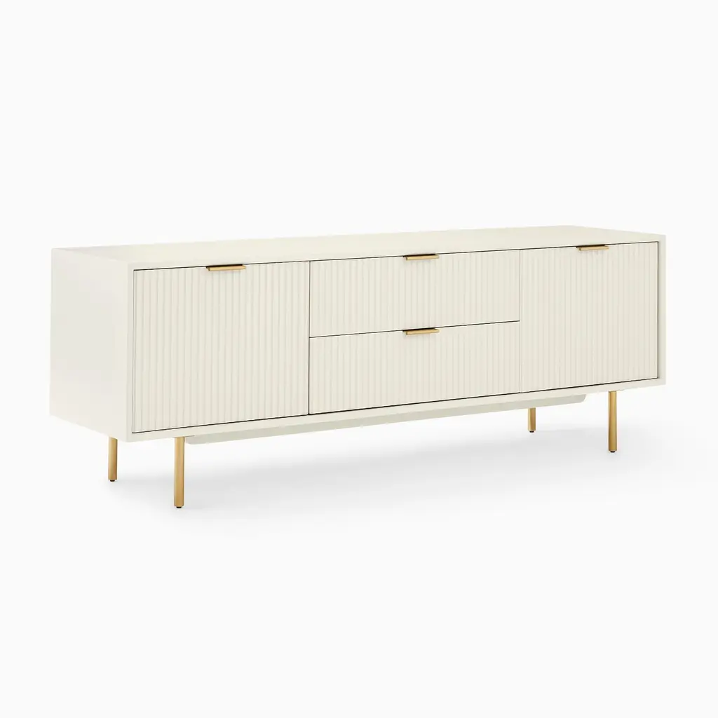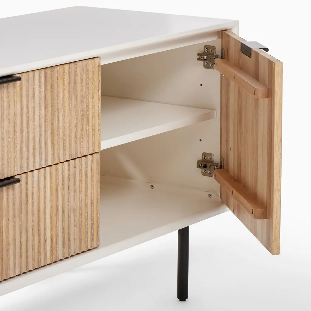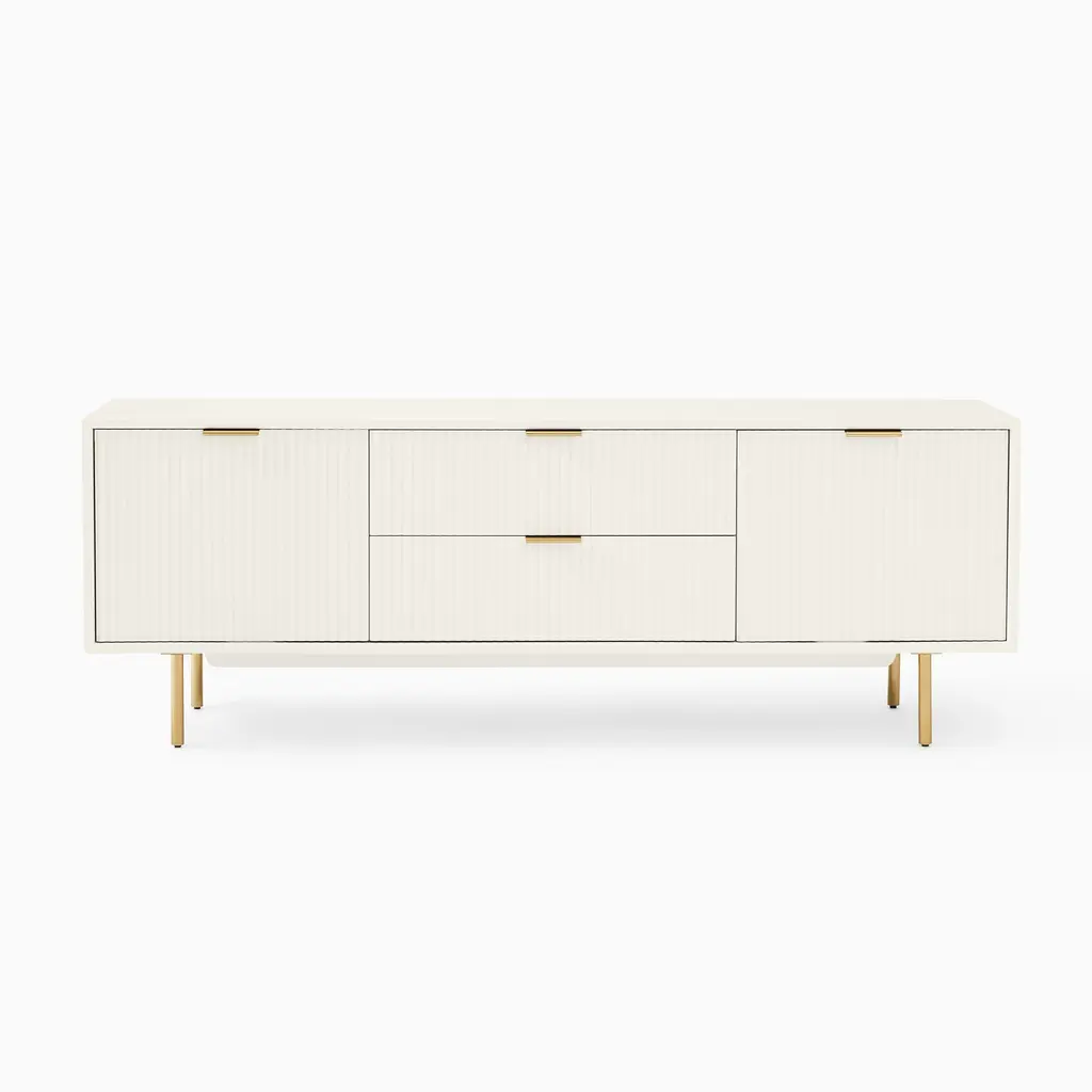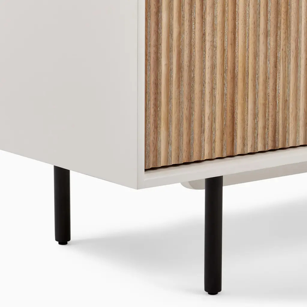 Streamlined shape with mixed materials. Contrast of smooth lacquer and fluted wood. Use it as a media console or a buffet. Contract Grade so you know it's built to last.