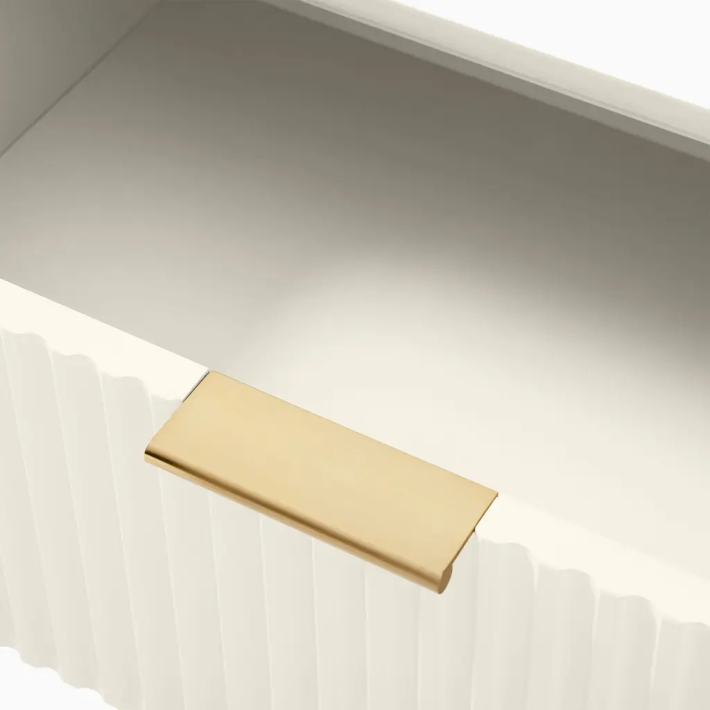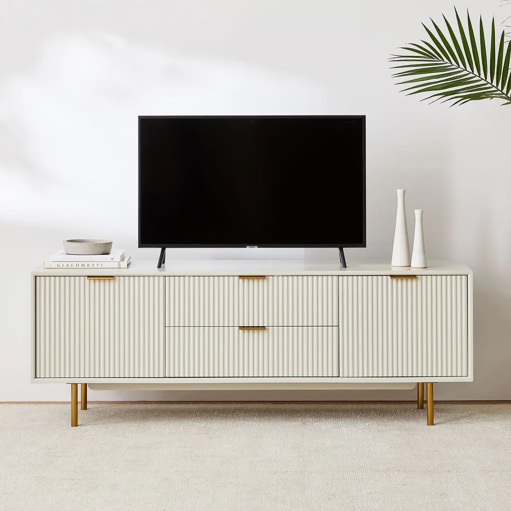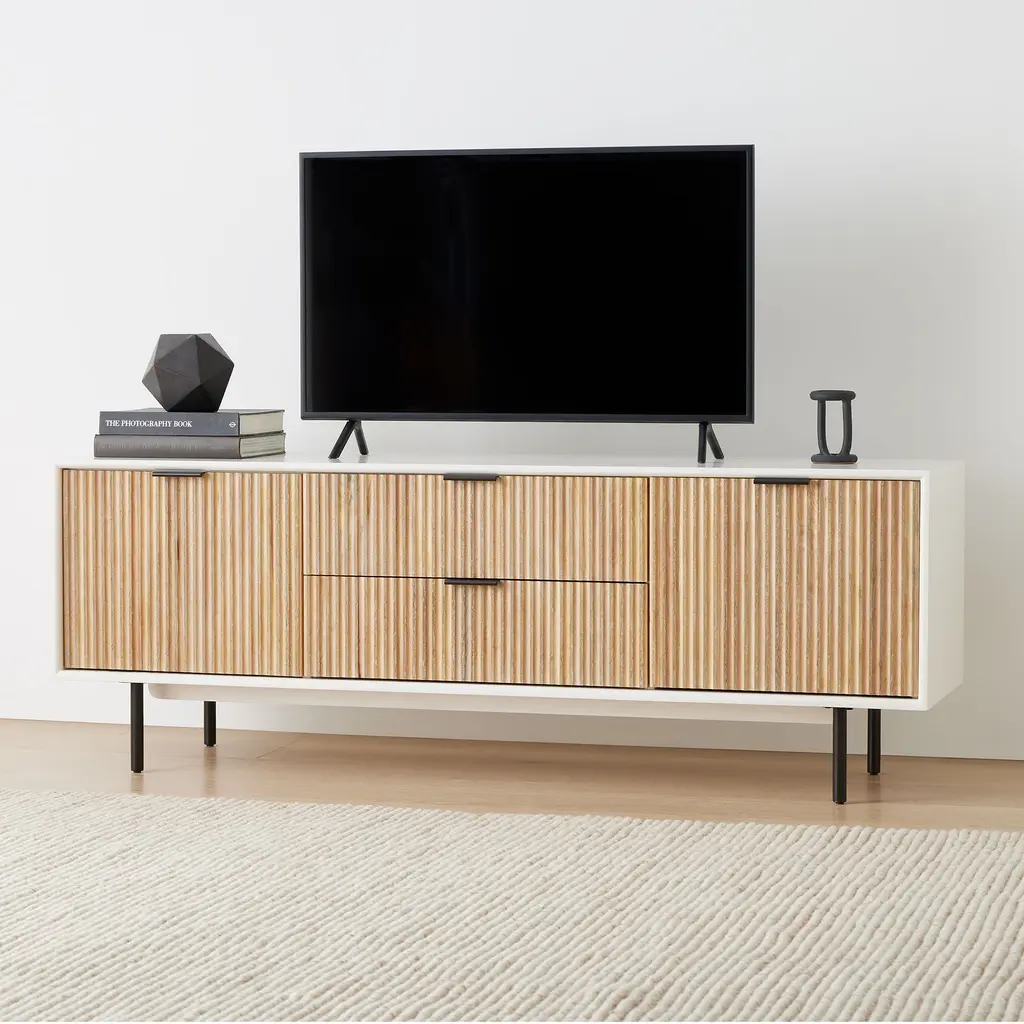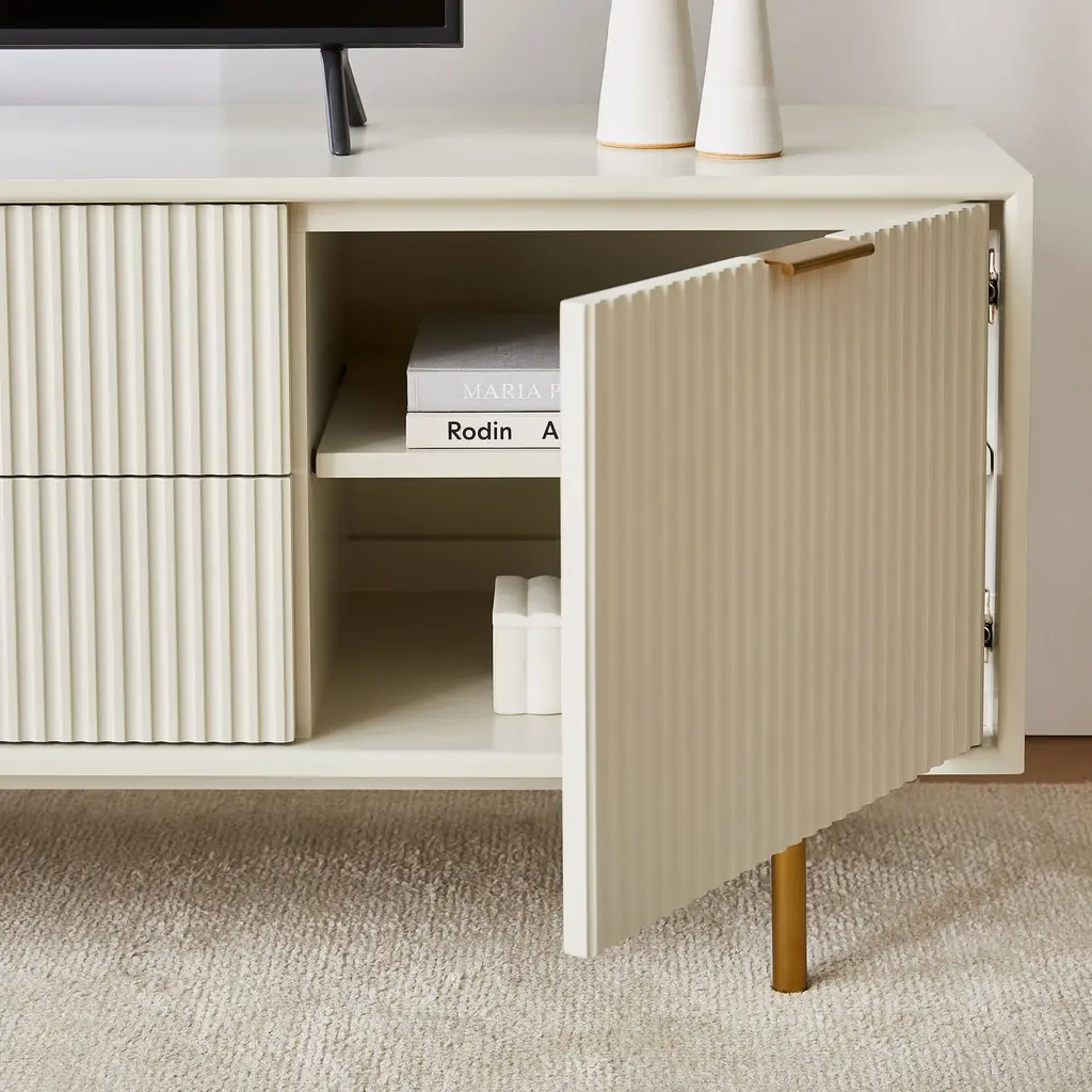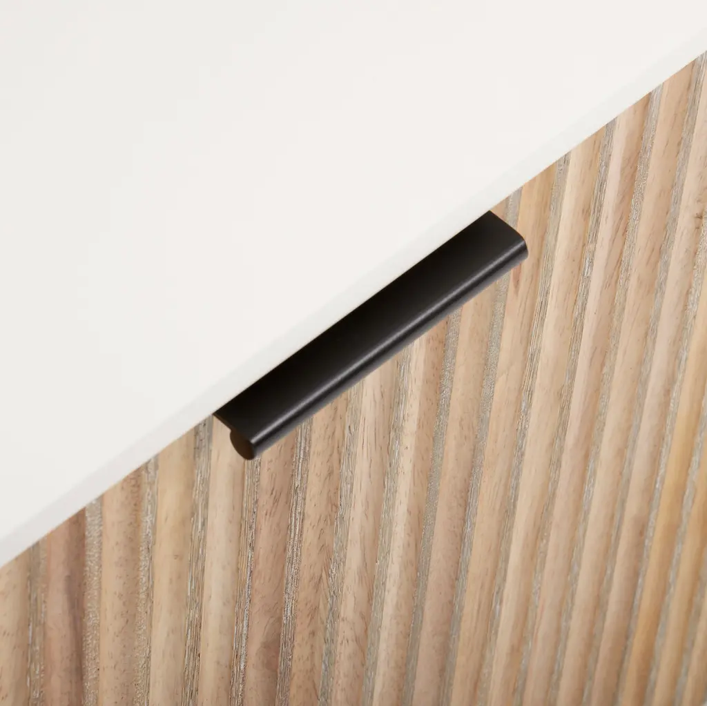 Streamlined shape with mixed materials. Contrast of smooth lacquer and fluted wood. Use it as a media console or a buffet. Contract Grade so you know it's built to last.