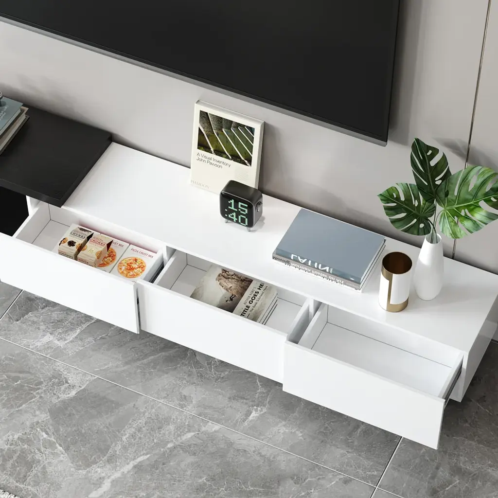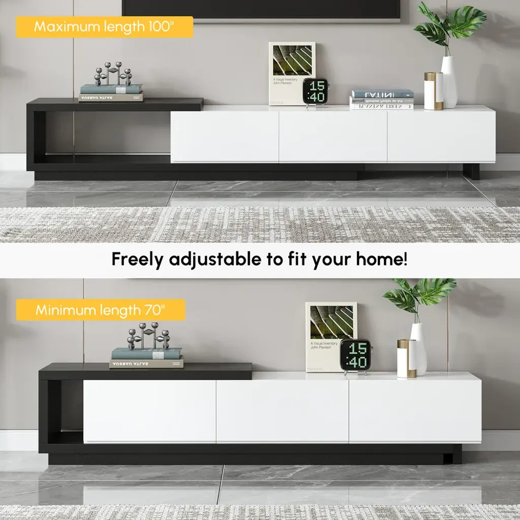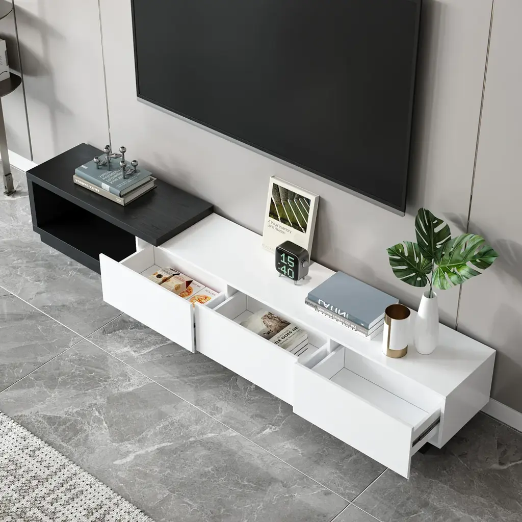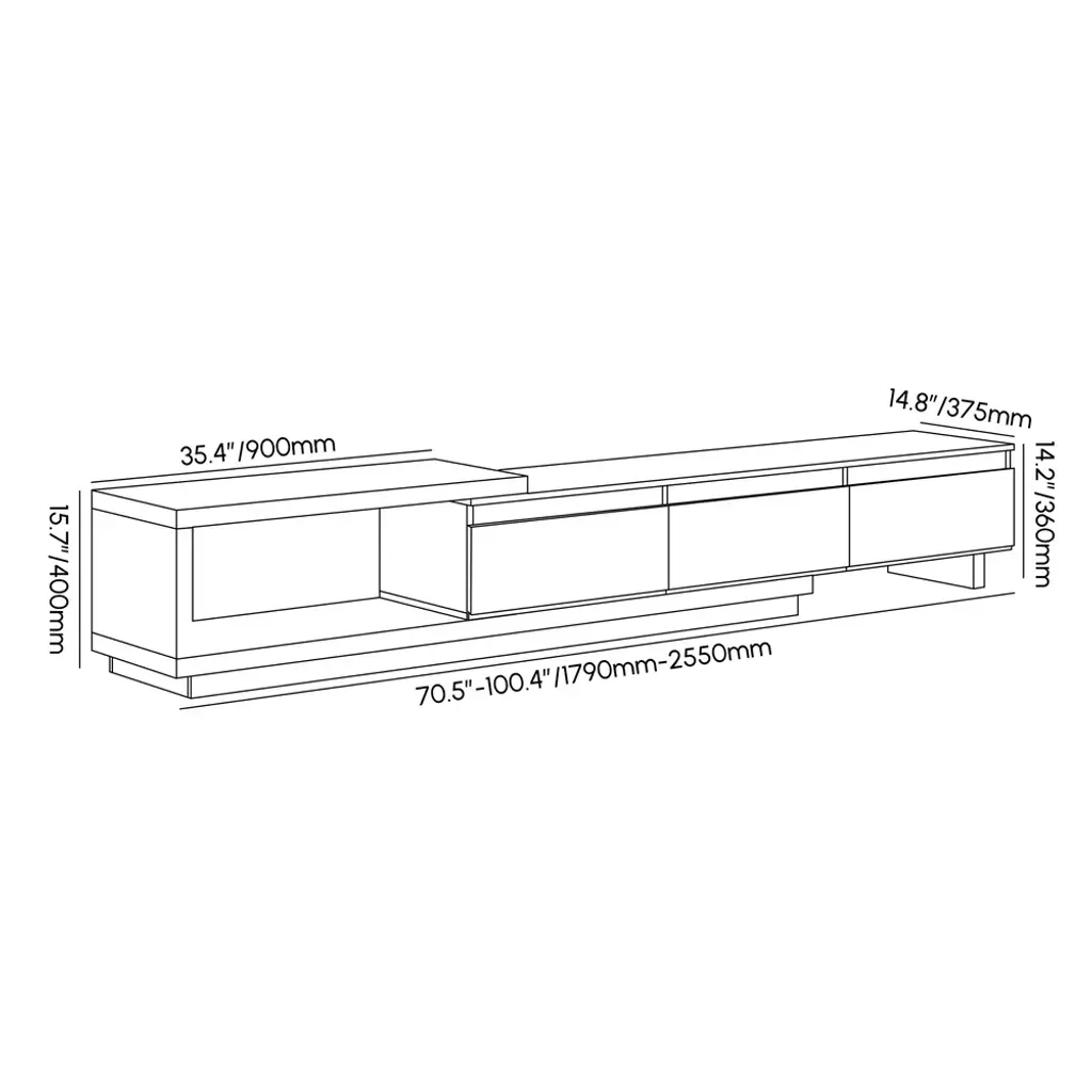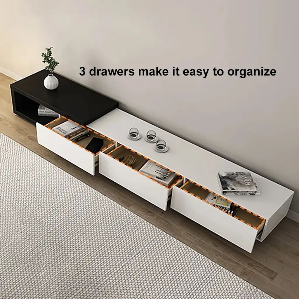 This contemporary extendable TV stand with three spacious drawers, providing a holding capacity for TVs up to 80 inches in size. It combines modern design with high-quality material to make it the perfect unit in any living area. This TV stand is perfect for holding media devices while adding a modern touch to beautify any living space.