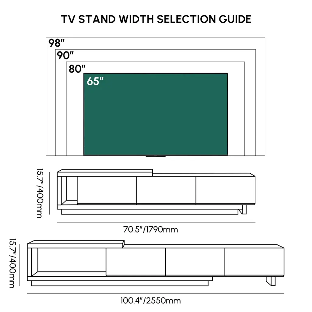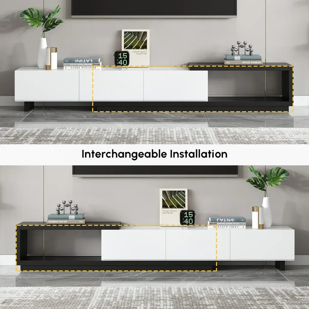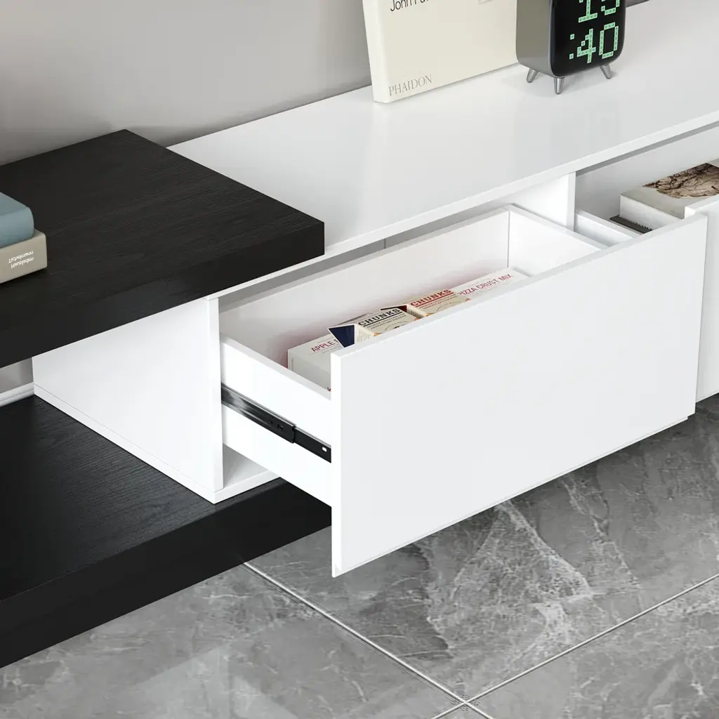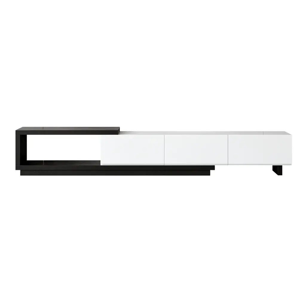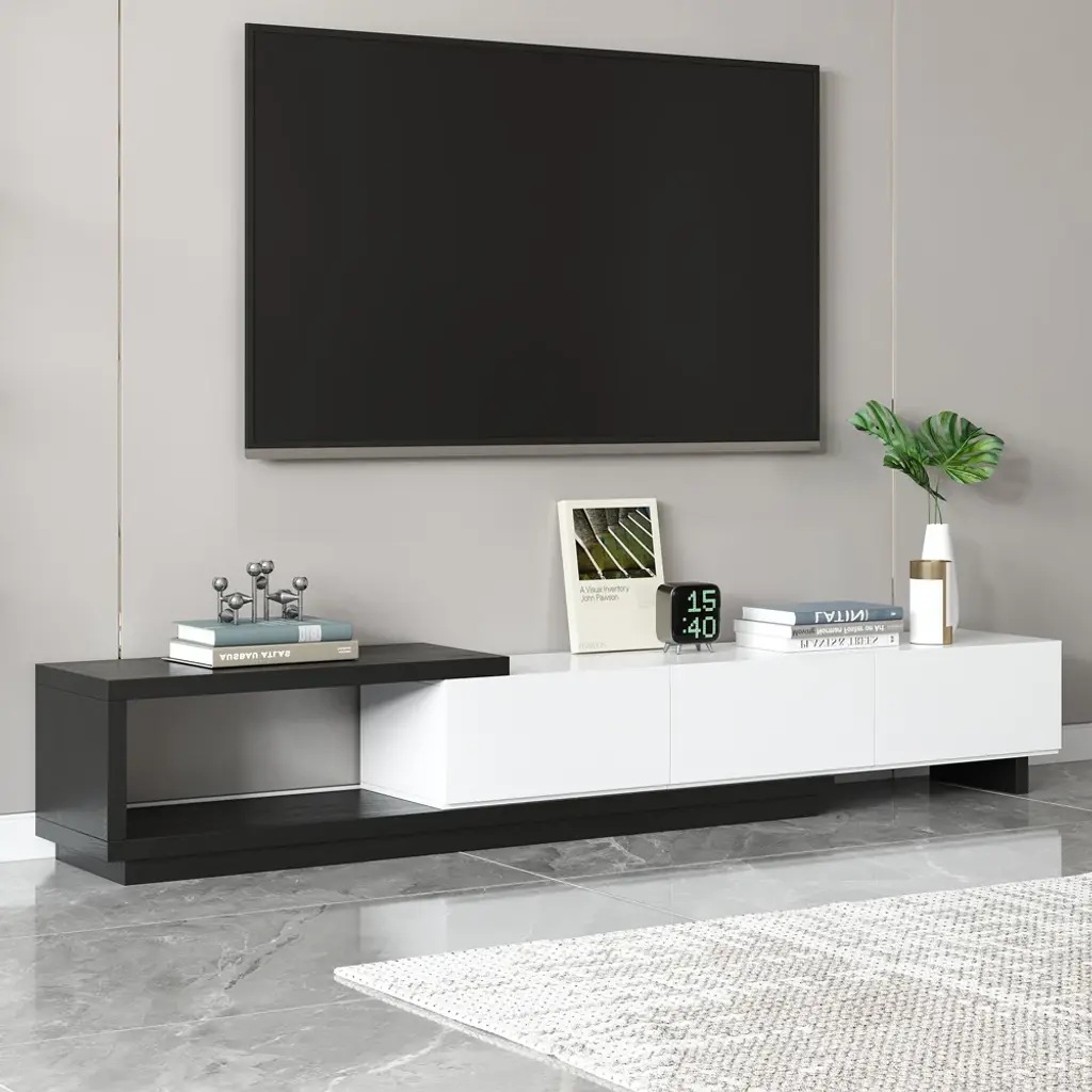 This contemporary extendable TV stand with three spacious drawers, providing a holding capacity for TVs up to 80 inches in size. It combines modern design with high-quality material to make it the perfect unit in any living area. This TV stand is perfect for holding media devices while adding a modern touch to beautify any living space.