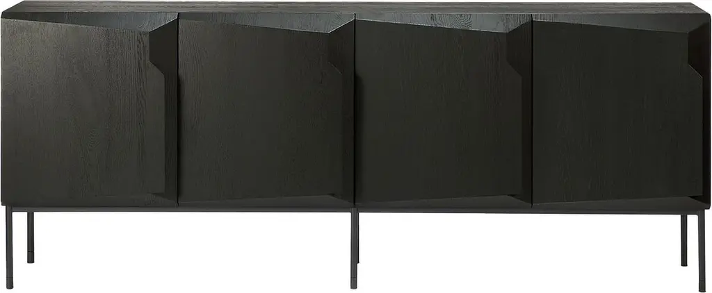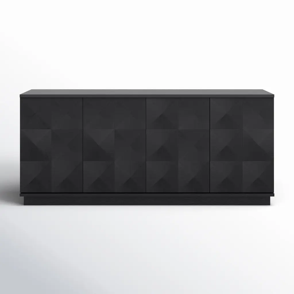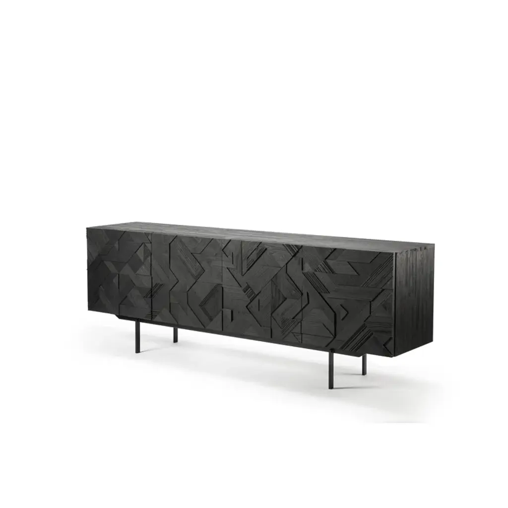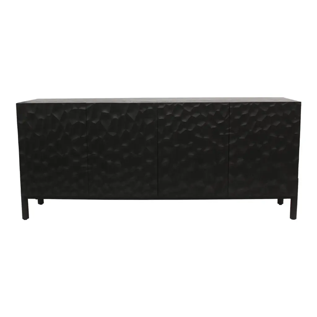 A carved honeycomb pattern wraps Raffael's black-stained exterior in conversation-sparking texture and dimension. Crafted of renewable solid mango wood, from trees no longer producing fruit, each facet of the intricate door fronts highlights the wood's lively grain. Set on a minimalist base of gunmetal-finished iron, the console makes a sculptural addition to a living or family room. Raffael's seamless façade features five doors that open to three fixed shelves that house media components or provide storage.