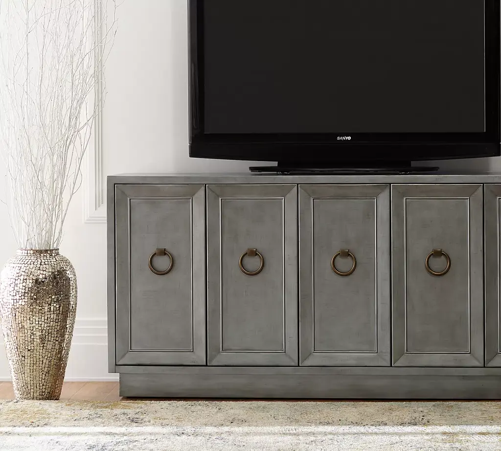 Contemporary by design and stunning to the eye, our Raven entertainment console will be the gem of your living space. Packed with style and equipped with convenient features, like cord management and magnetic-touch doors, this piece features a striking, multi-step, silver finish on oak veneers. Modern, drop-ring pulls with a bronze finish adorn each door to complete the look.