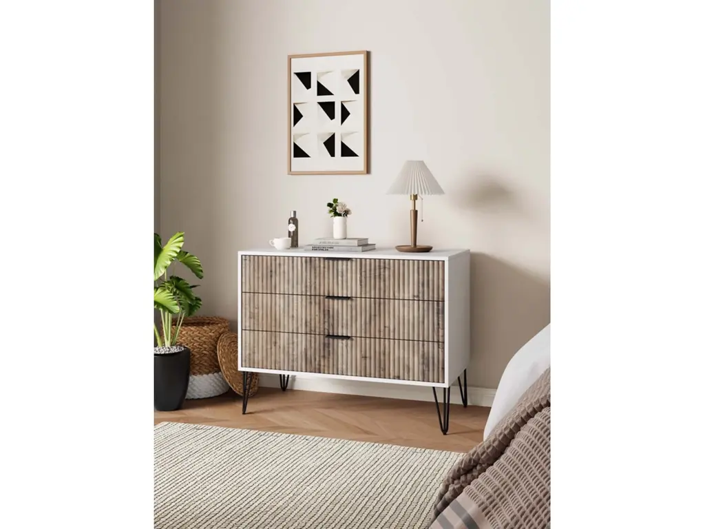 The Ravenswood media cabinet lives at the intersection of iconic and fresh, with lines that are sleek and unbroken. This scaled-down midcentury-modern media cabinet (its influences are obvious) mixes materials with ease. Cathedral walnut veneers and wire-brushed Indonesian mahogany solids form the top and sides of this small modern media cabinet, while engineered hardwood is carved into a striking diamond grid pattern in front.