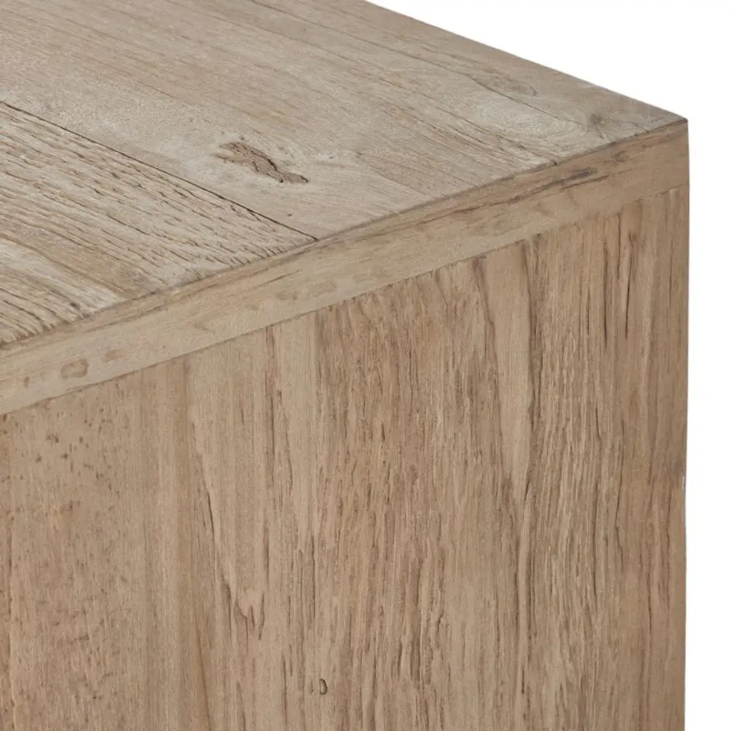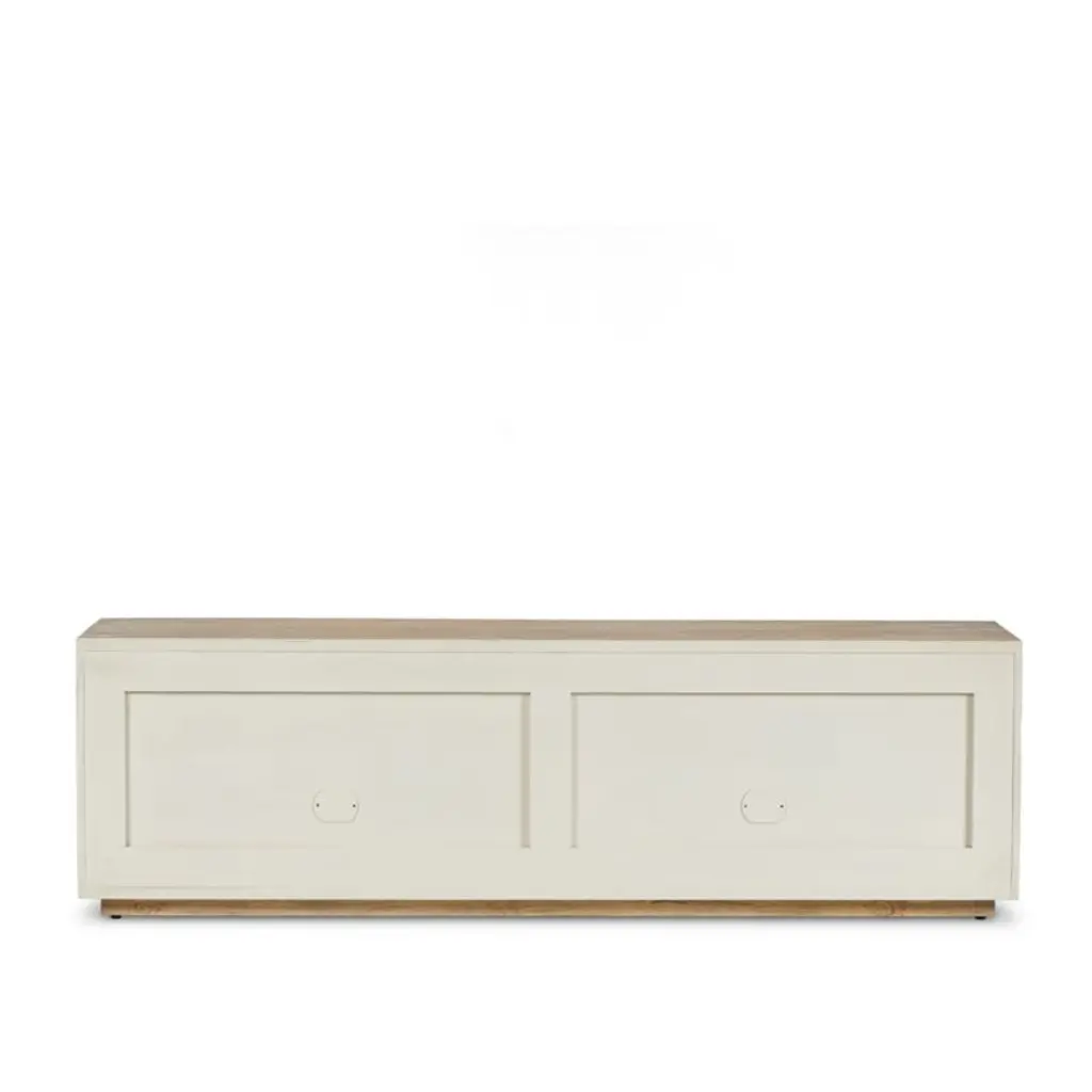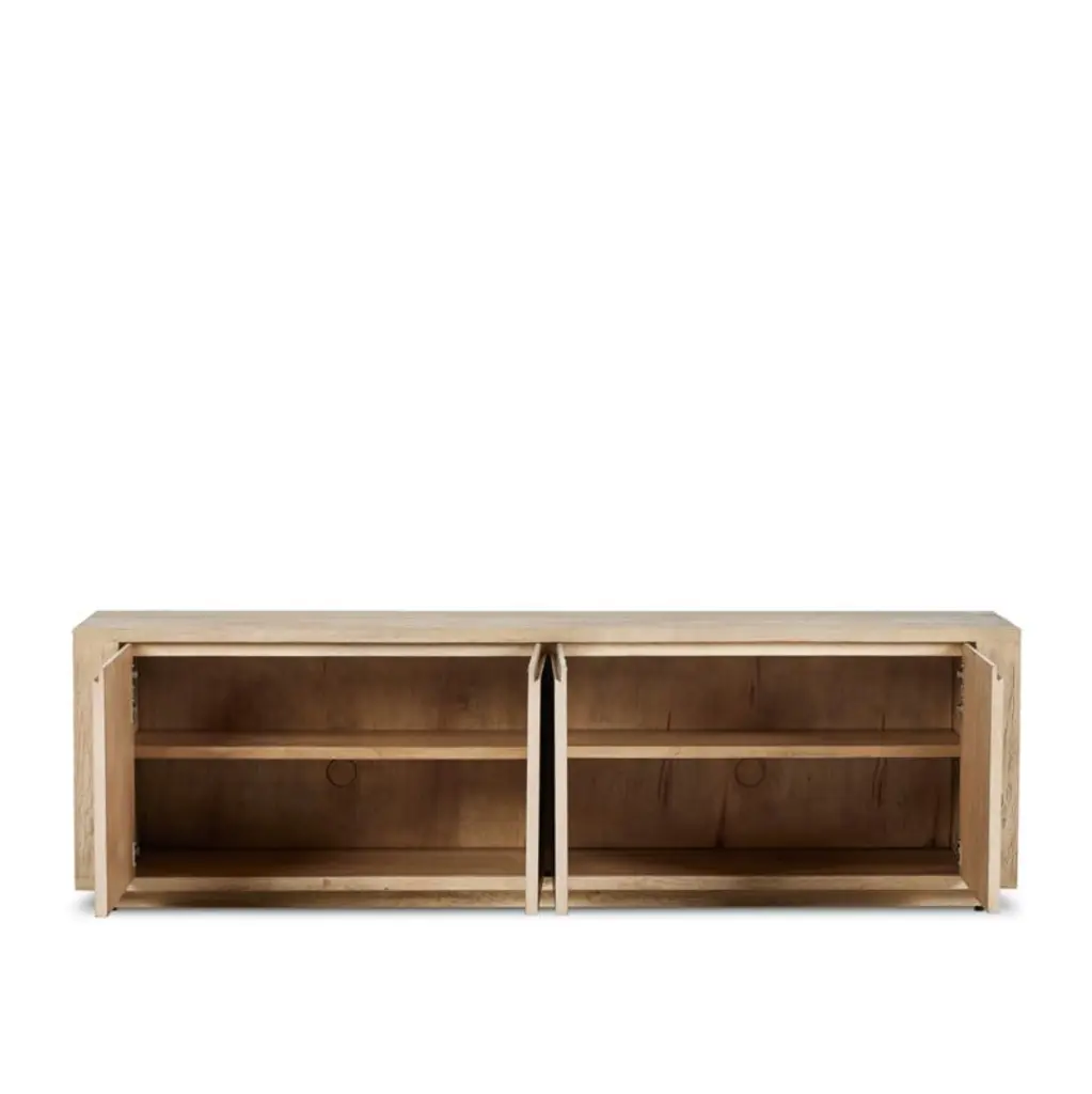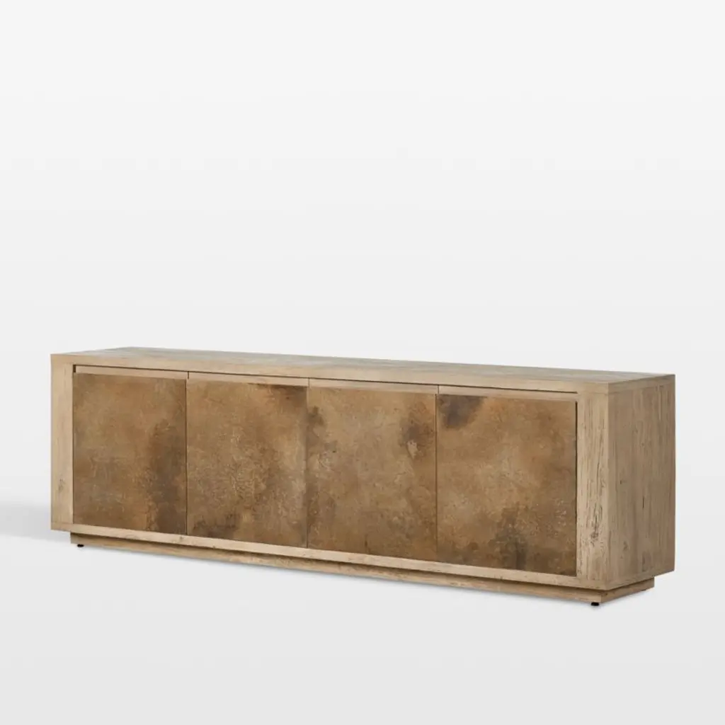 Our Redondo media console is simply styled to make the most of its dramatic mix of materials. Framed by alder wood, the cabinet doors fronted in oxidized aluminum create a fascinating tableau of unique patterns with brass undertones. Not just pretty to look at, the console provides ample storage with one removable shelf per cabinet and cord cutouts to accommodate media components.