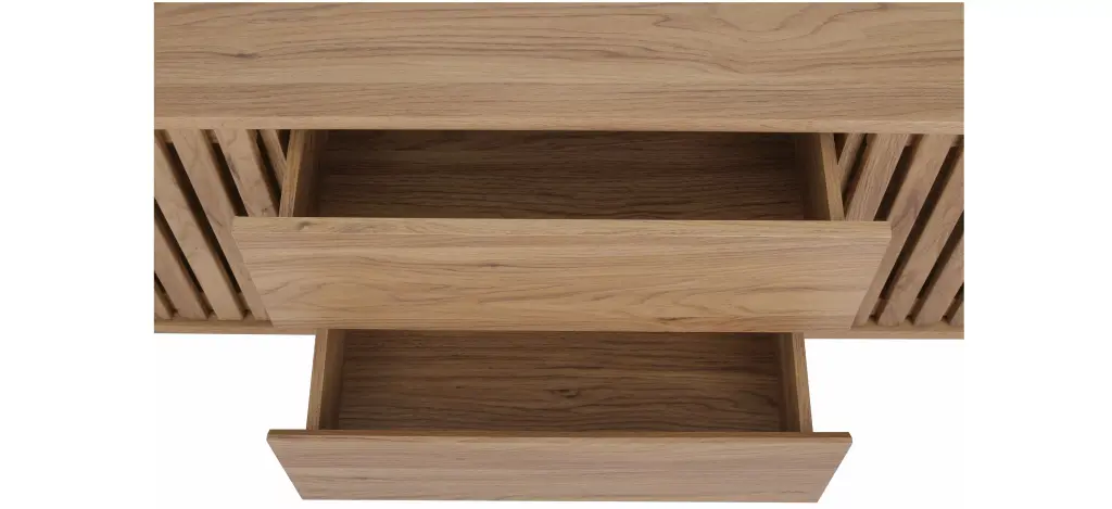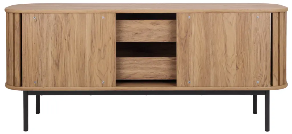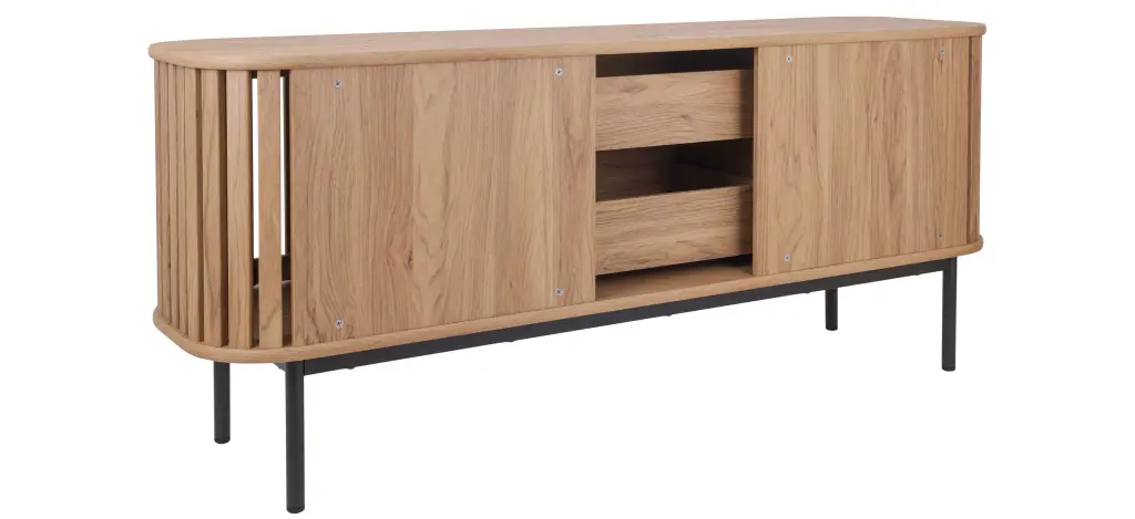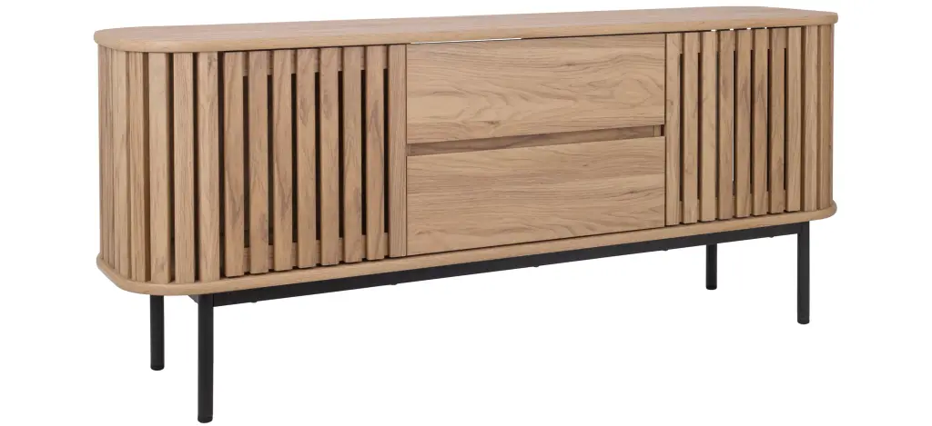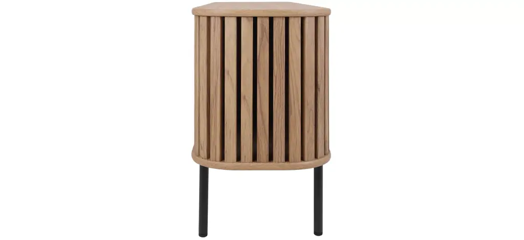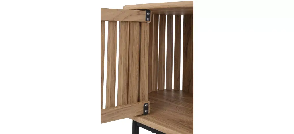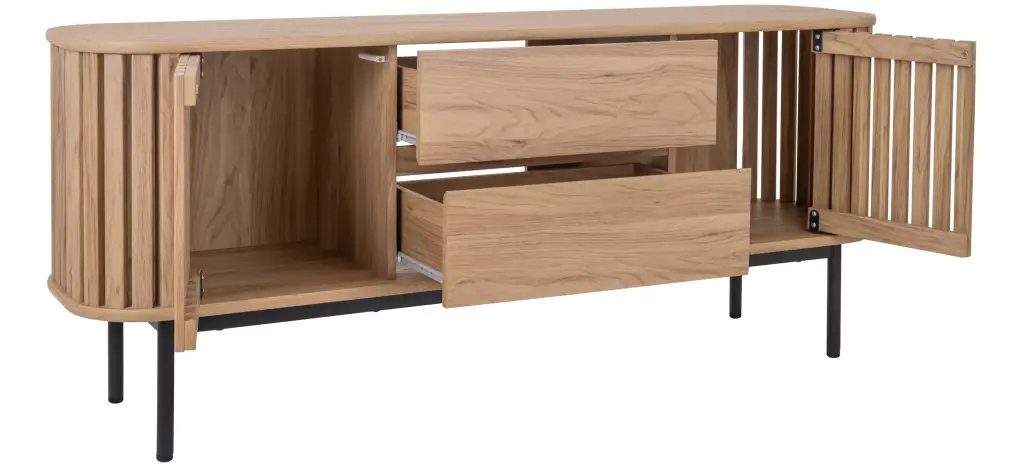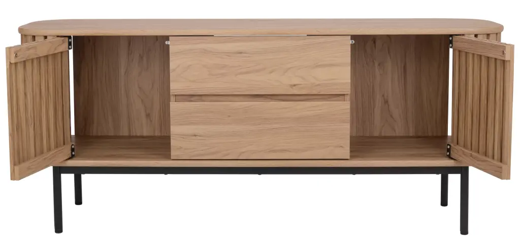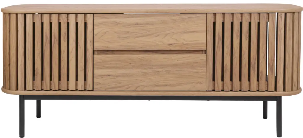 Modern Aesthetic in Mid-Century Flair! The Renwick TV Stand is great for 50" - 59" TV size. It incorporates tambour cabinetry construction by highlighting its rounded curves with horizontally arranged slats for the side frame. 2-Drawers and 2-Doors for ample storage. Painted steel legs provide sturdiness and overall minimalist vibe to the design.
