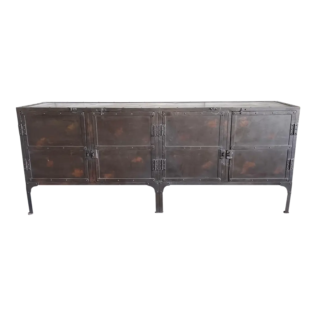 Industrial style long storage cabinet, media console, tool chest or buffet cabinet. Fits perfectly against the wall under a TV, or behind a couch. Great as a divider in a large room. This heavy duty piece has 4 separate storage compartments, each with its own door, and top and bottom shelf. Doors open on metal hinges. Total length measures 76.” Each door is approximately 17.”