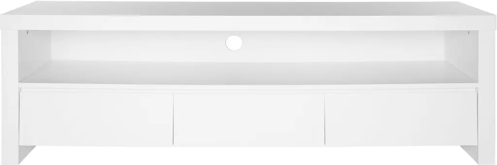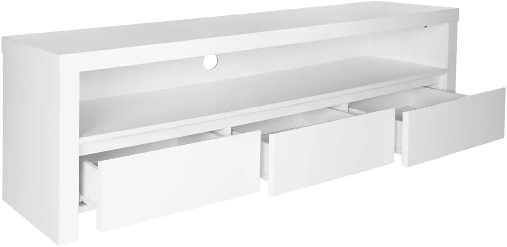 Sleek, simple, and able to complement just about any style of decor, this media stand has three drawers as well as a wide open shelf with a rear cutout for cord management.