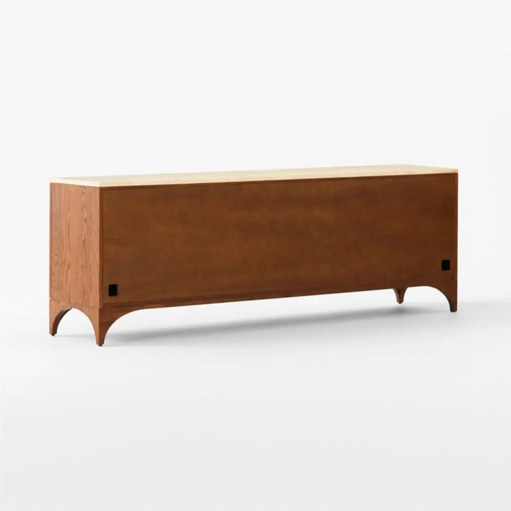 Minimalist white oak media console by Barcelona-based Mermelada Estudio is designed to give full expression to the wood. The streamlined silhouette reveals a juxtaposition of crisp corners and rounded legs that finish in an arc at each end. Topped with a slab of honed travertine for a raw finish with visible unfilled pitting. CB2 exclusive.