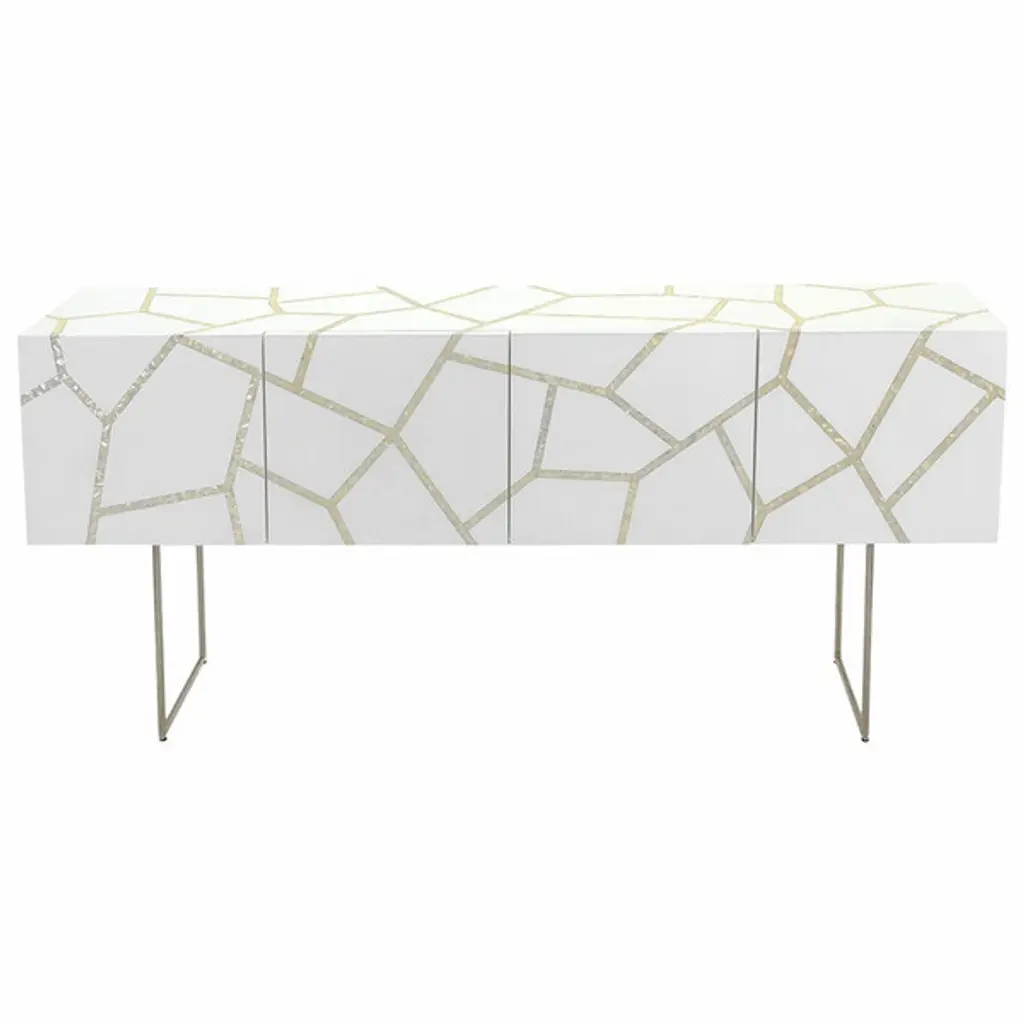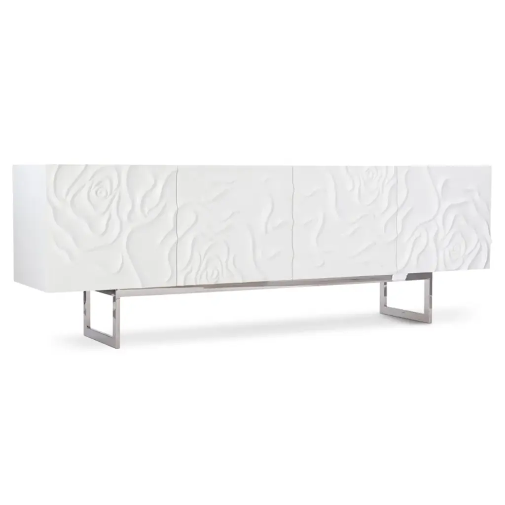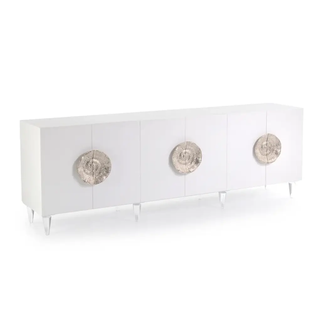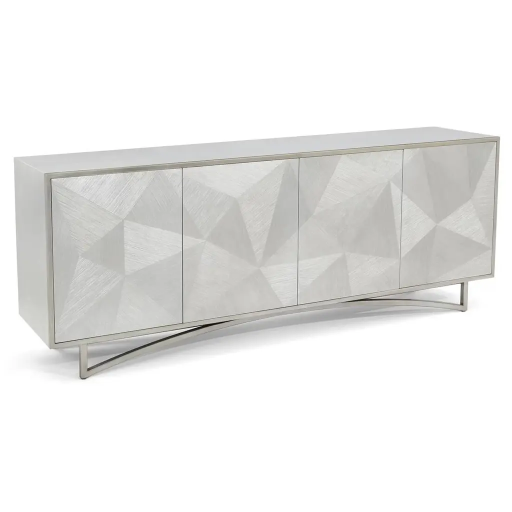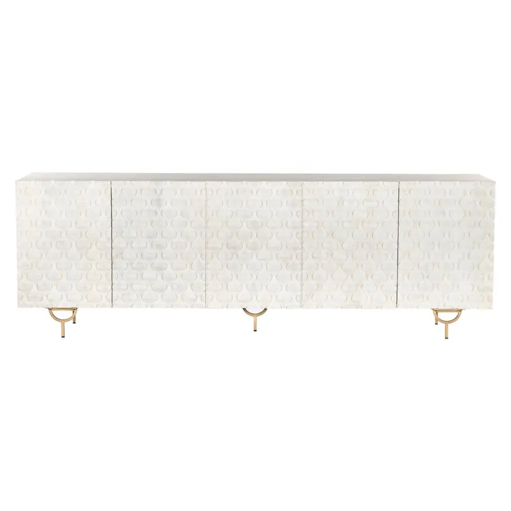 Clean and modern, this media console showcases white-washed mango wood with an intricate carved mermaid scale pattern throughout, with spacious shelving for all your entertainment needs. This modern console looks right at home in Boho and Globalist spaces alike, with its clean white-washed mango construction, unique mermaid scale-inspired textured carving, and rounded iron legs.