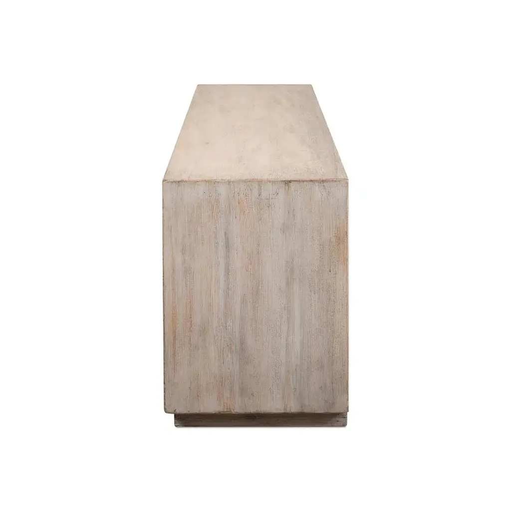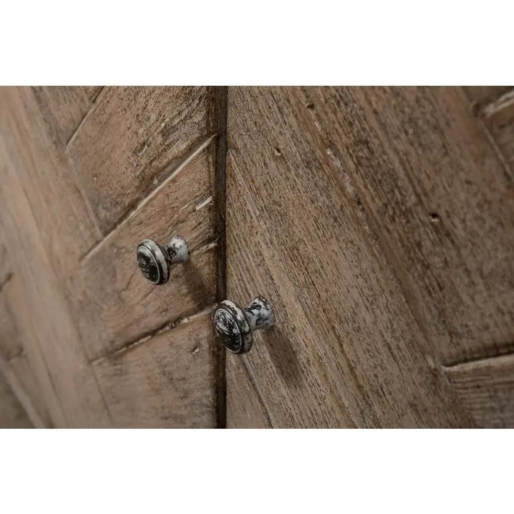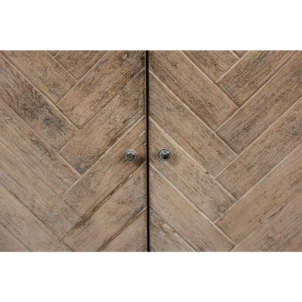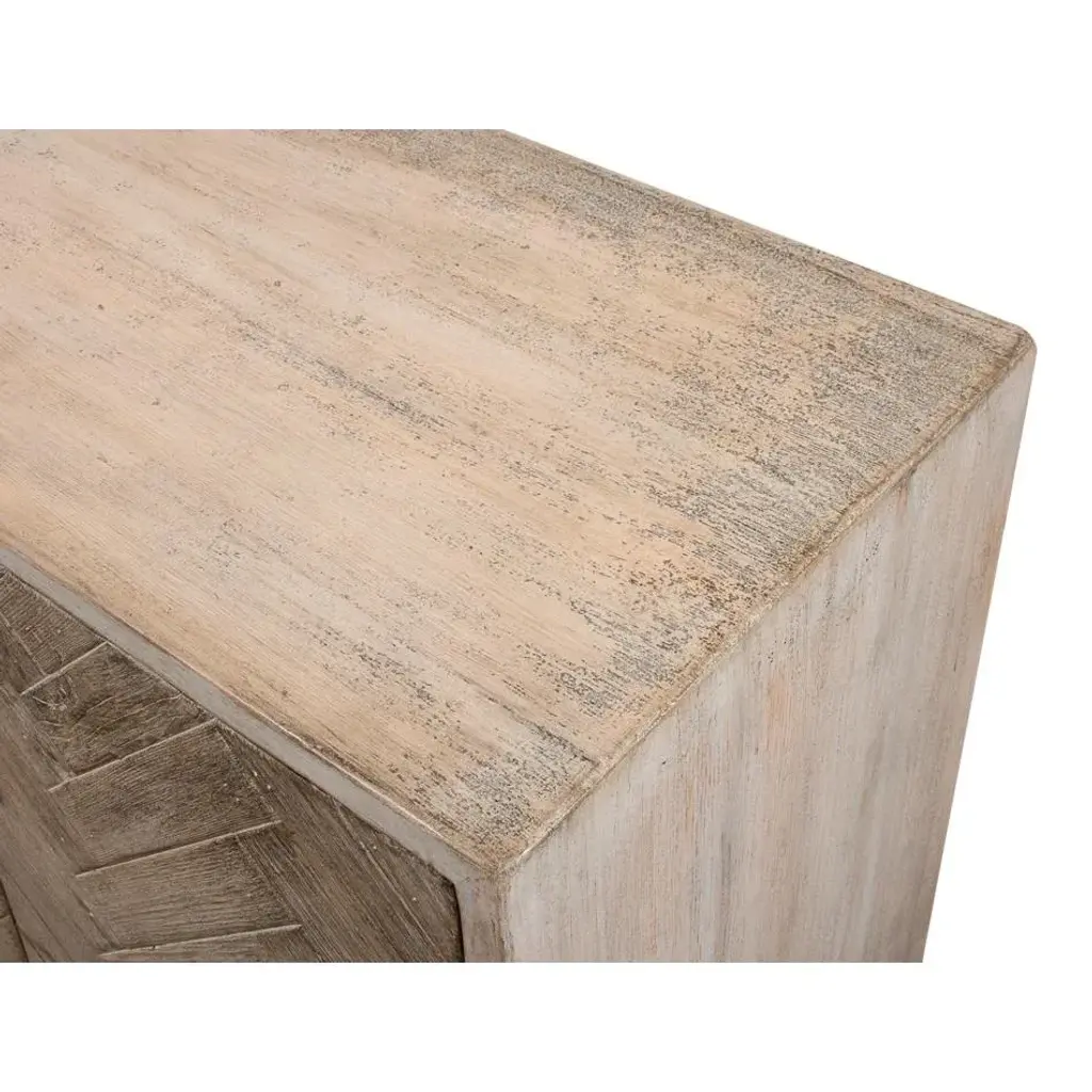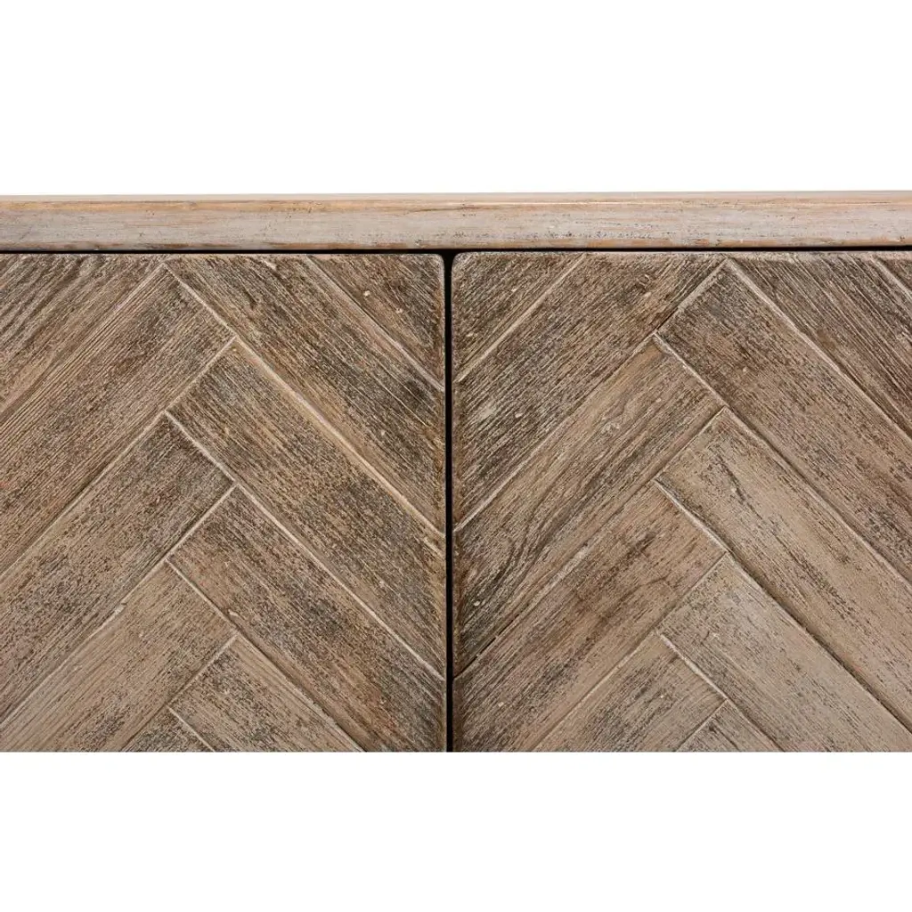 Elevate your home with the perfect blend of form and function. This sideboard boasts a timeless chevron herringbone pattern, adding a touch of artisanal sophistication to your space. With generous storage behind four sleek doors, it’s ideal for keeping your essentials tucked away yet accessible. Perfect for a mid-century modern or classic setting, this piece not only serves as a functional asset but also as a statement piece that complements your discerning taste. Made with reclaimed pine and finished in an antiqued distressed stone gray frame with natural finished doors. Dimensions: 65" W x 17" D x 24" H