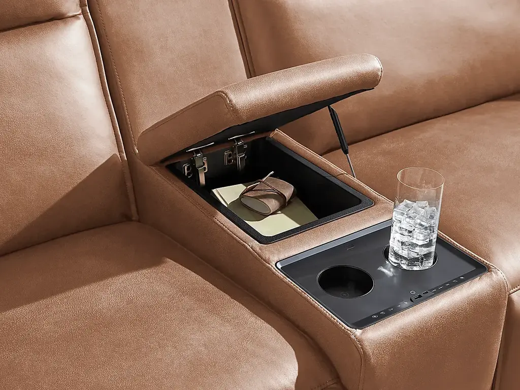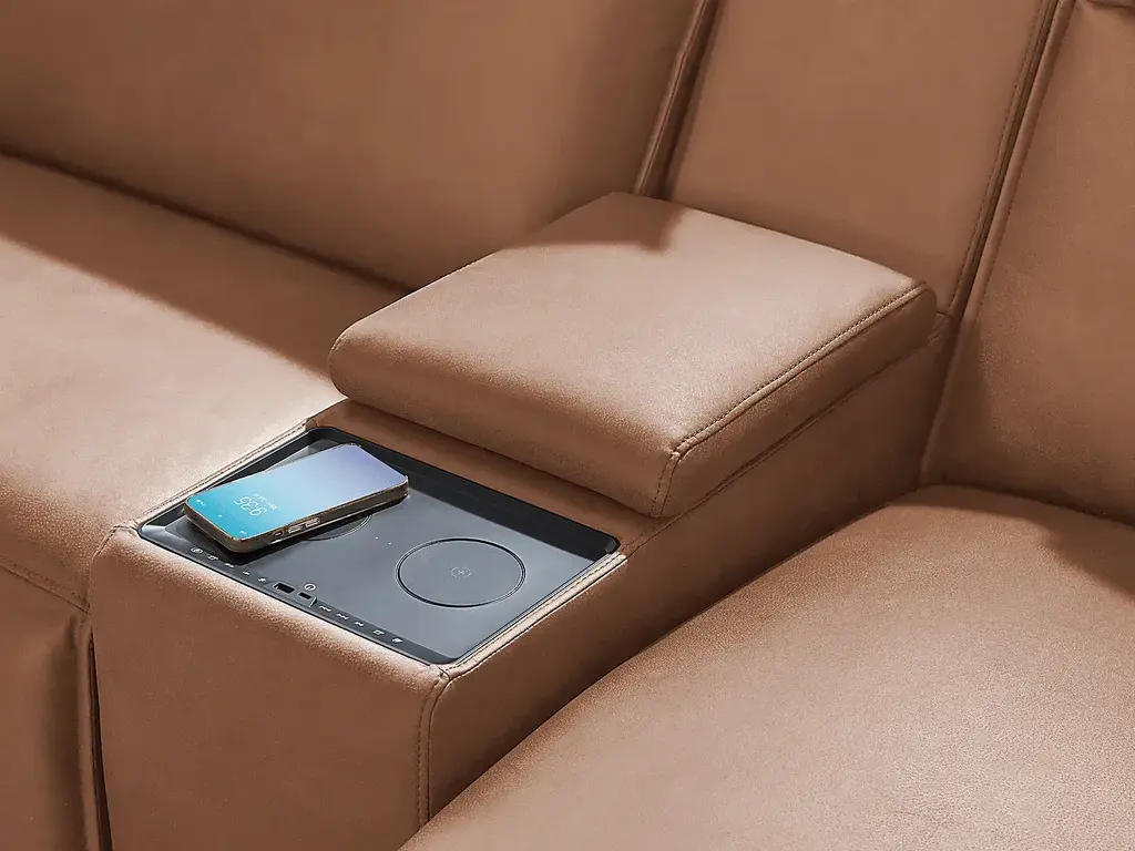 Discover the unlimited possibilities of the dual power reclining ModularTwo, thoughtfully designed with both comfort and flexibility in mind. Contemporary in style and upholstered in a plush suede-soft saddle colored microfiber, its tailored silhouette is enhanced by welted track arms and tufted back cushions for a look of refined elegance and serenity. Each piece is upholstered on all sides, offering endless opportunities for both reconfiguration as well as individual use. Dual power reclining functionality allows for easy adjustment in the headrest and back, providing the ultimate in personalized comfort. Two consoles with bluetooth-enabled speakers, retracting cupholders and wireless charging are included. Select a preconfigured design or visit a showroom to learn about individual components and create the modular solution perfect for your space and style. Upholstery: 100% Polyester