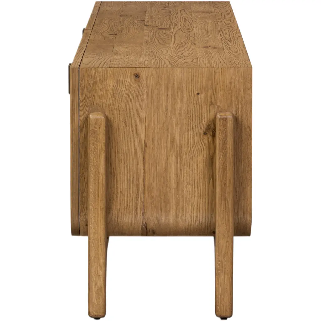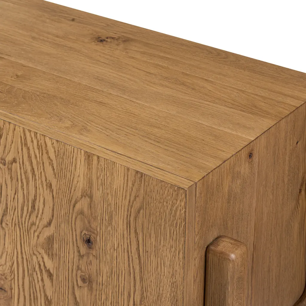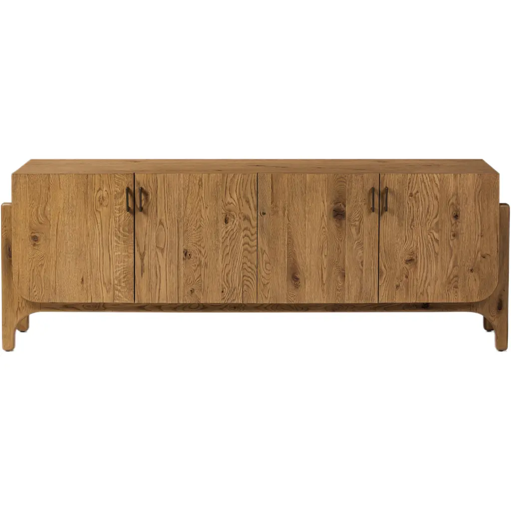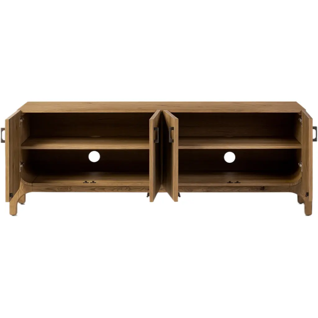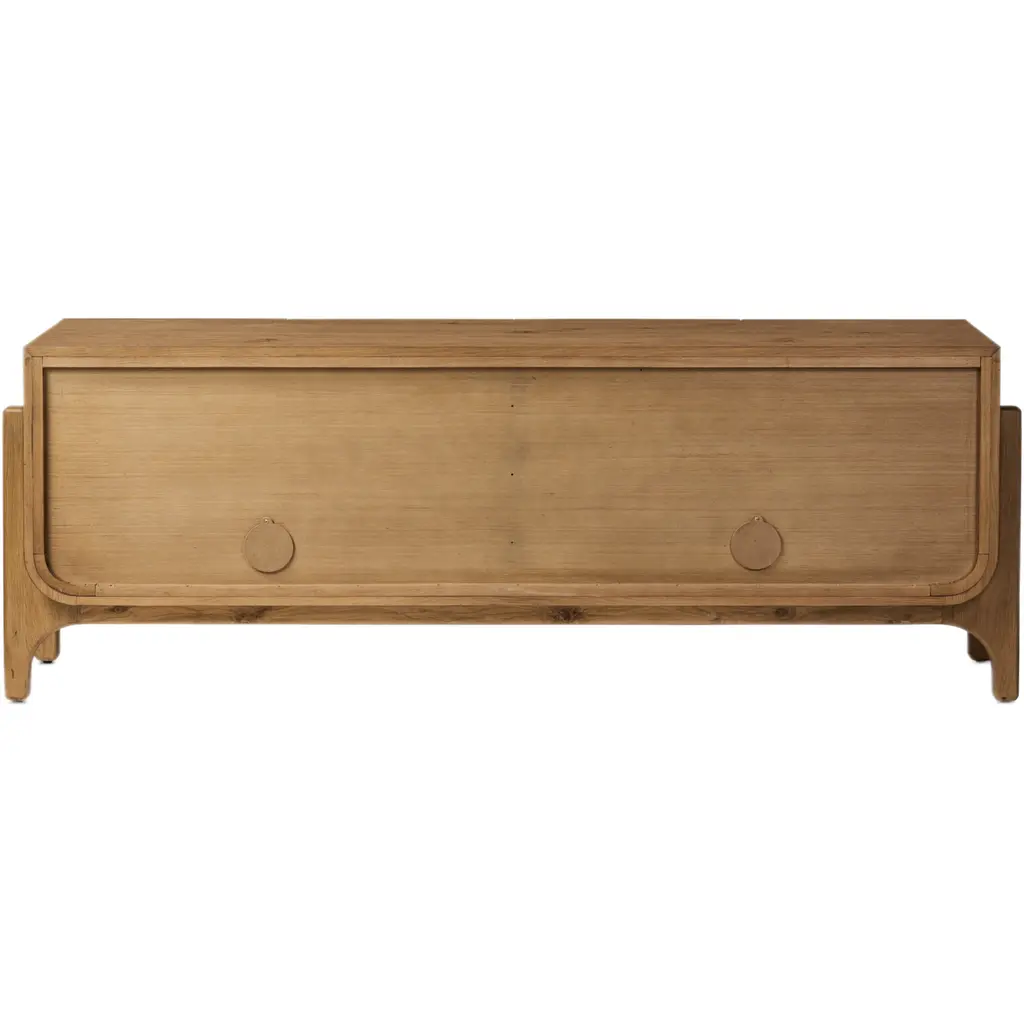 The Serenwyn Media Console exudes an elevated, artisan charm with its gracefully curved cradle base. This exquisite piece offers generous interior storage, providing ample space for all your media essentials. Thoughtfully designed with rear cutouts, it ensures seamless cord management, making it both a stylish and functional addition to your living space.