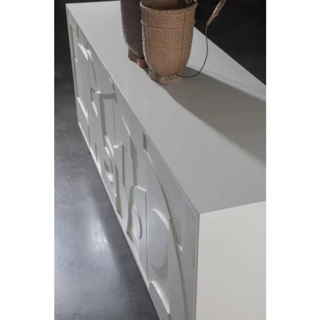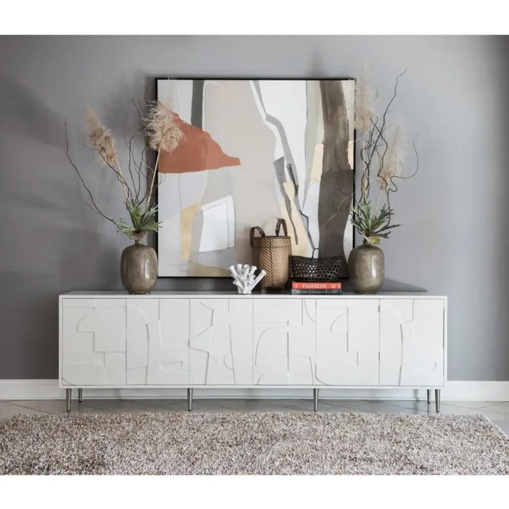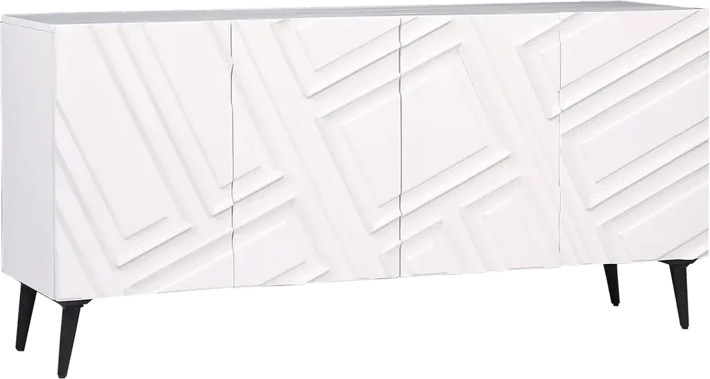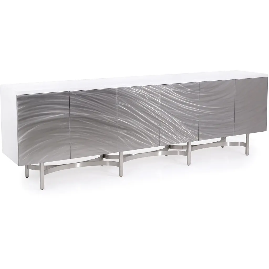 This product features oak veneers that have inlays of textured metal in circular patterns and straight-line configurations. Beautiful hardware. The Barton Cabinet is an impressive 108" wide. Gunmetal iron.
