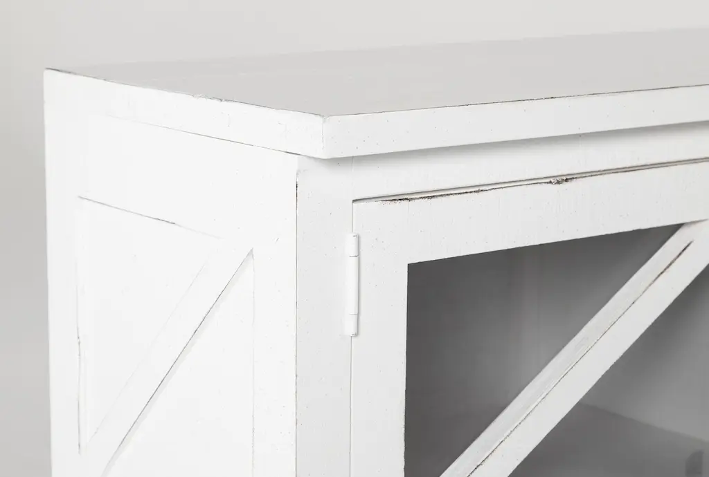 A casually distressed finish gives the Sinclair TV stand its charming weathered texture and reveals the natural beauty of a streamlined solid pine design. Ethereal in white, the piece is adorned with understated pewter hardware.