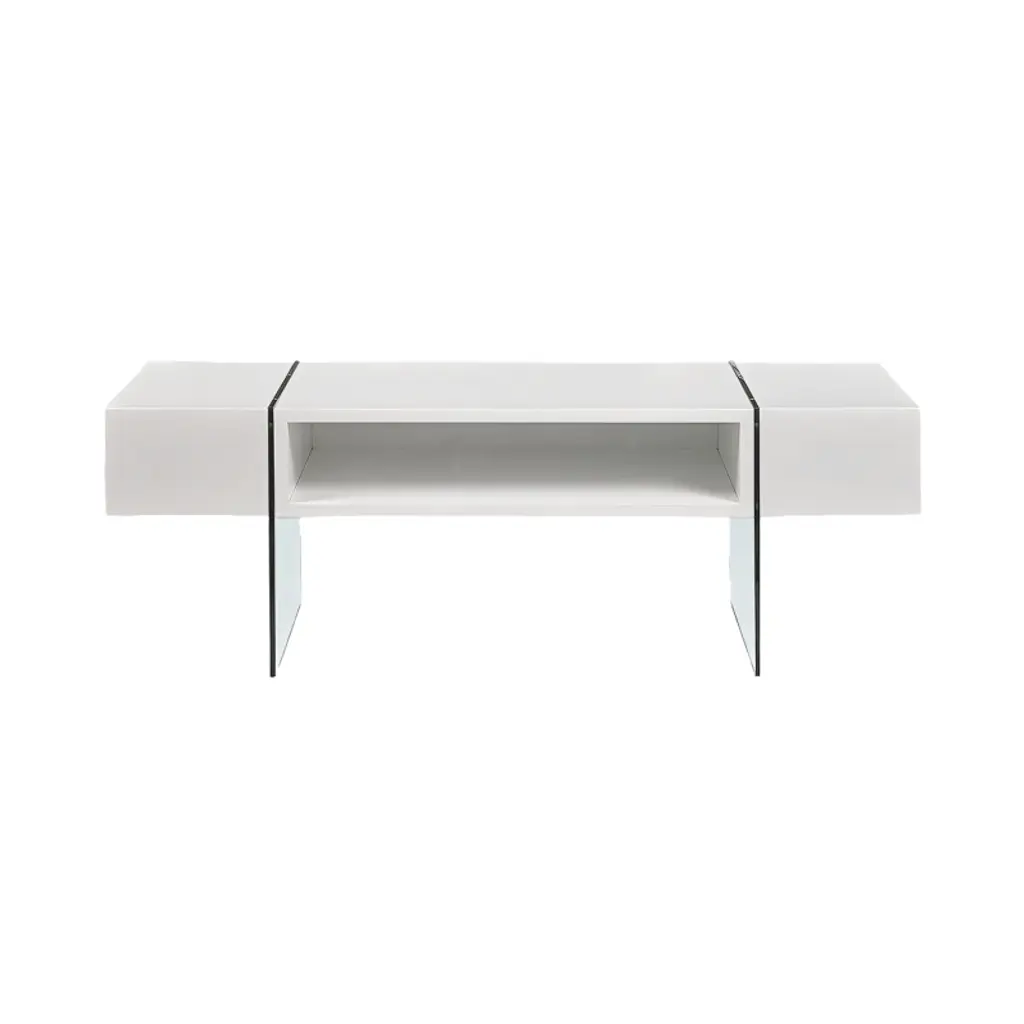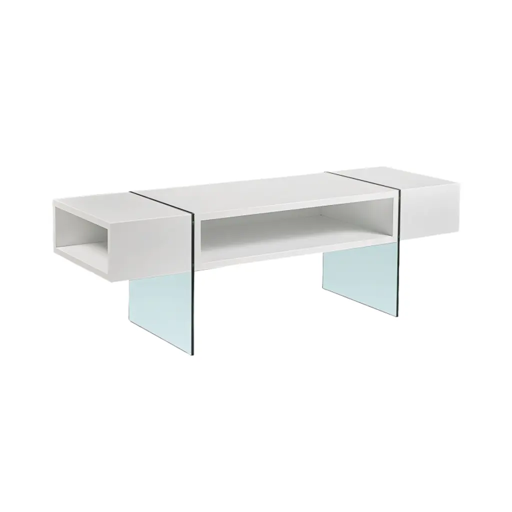 Light and fanciful, the contemporary style of the Soho TV Stand in White will add a prominent design element to any space. Featuring three shelves for ample storage, this piece aides in an organized living room. Crafted with glass legs and white wood finish, the Soho TV Stand in White holds any TV with elegance.