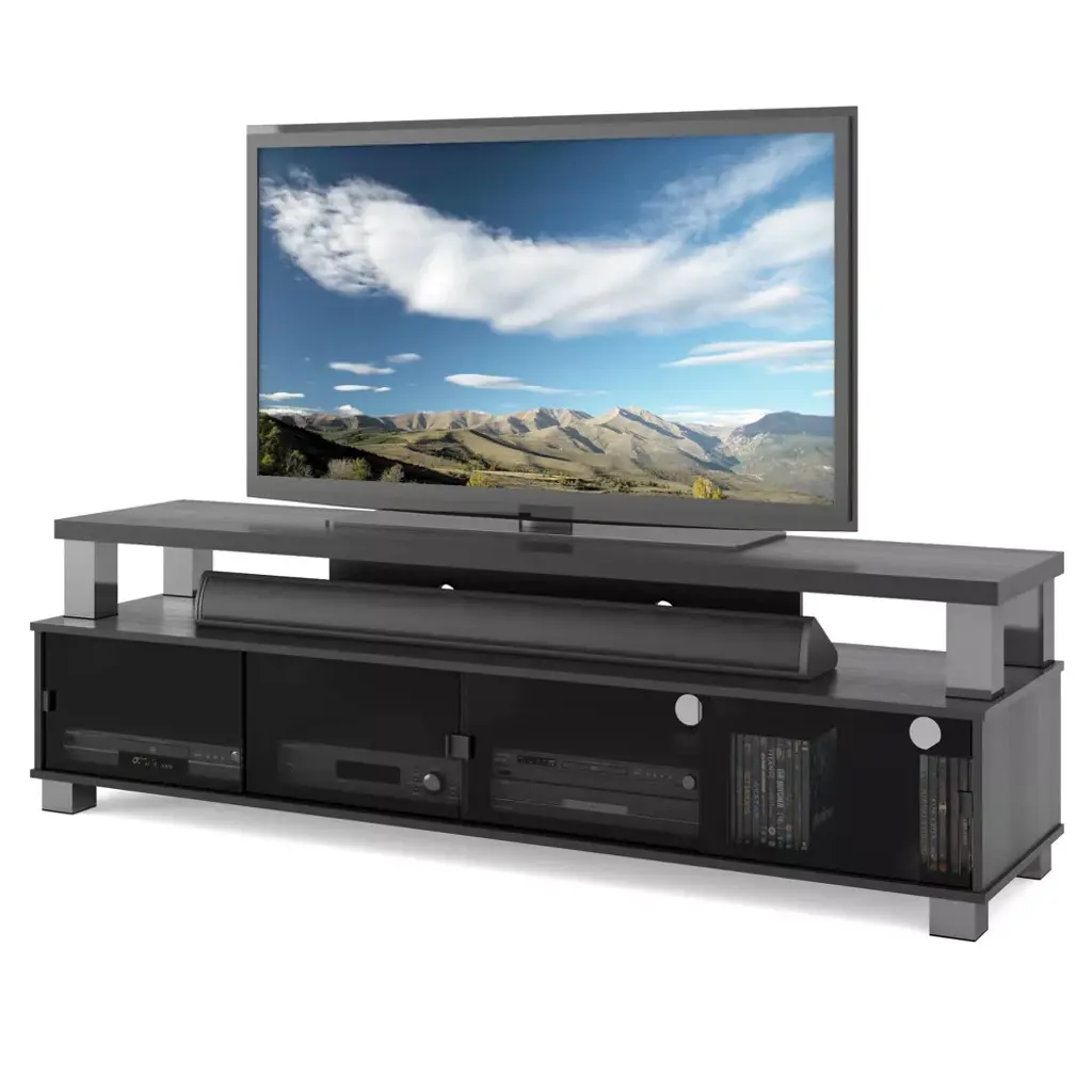 Showcase your flat‐screen TV with the sleek and spacious Bromley Extra Wide TV Stand. Designed to accommodate most TVs from 48" to 95", this stand features a rich ravenwood black finish and sleek metal posts that add a touch of modern elegance to your living room. The extra‐wide two‐tier design offers ample open shelf space, perfect for sound bars, audio equipment, and various components.Product dimensions: 22.5"H x 75.25"W x 19.75"DMax weight: 201 pounds