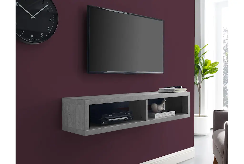 The Stone Grey 48" Wall Mounted Floating TV Stand is a modern, wood-constructed piece designed for the living room. Its stone gray color and floating shelf appearance make it a sleek addition to any space.