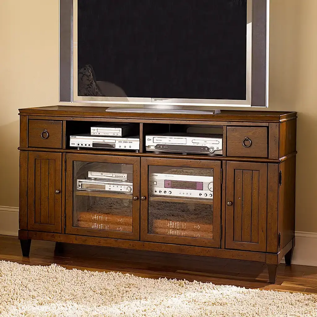 Discover the perfect blend of style and functionality with the Sunset Valley Entertainment Console. Crafted from rich mahogany veneers and sturdy hardwoods, this elegant piece elevates any living space. Its thoughtful design features two small drawers for discreet storage of remotes and accessories, while two open compartments provide easy access to media devices. Flanking each end, two small doors conceal additional storage space, allowing you to maintain a clutter-free environment. The console's warm wood tones and sleek lines effortlessly complement both traditional and contemporary decor. Whether showcasing your favorite media setup or displaying cherished mementos, the Sunset Valley Entertainment Console stands as a testament to timeless craftsmanship and practical design, promising to be the centerpiece of your home entertainment for years to come.
