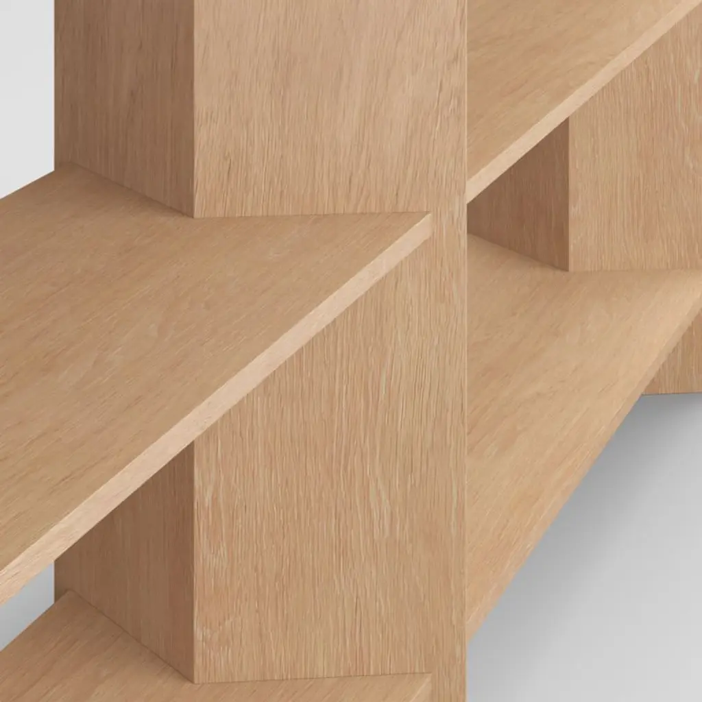 Terrazza transforms household storage with unexpected angles and intersecting shapes. Triangular legs rise straight to the top, lending a sense of movement to the media console's clean, rectilinear profile. Designed to show off the beauty of the natural oak, the media console is gently wire brushed and given a light ivory ceruse finish to bring out the wood grain. The generously sized open-storage console has four fixed shelves that let it double as a low bookcase or media cabinet.