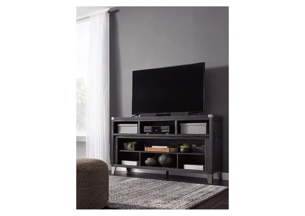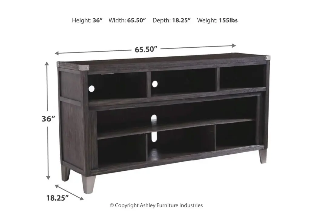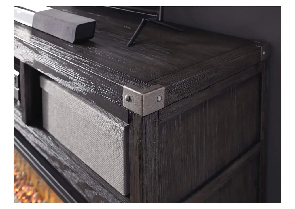 Make watching TV a joy. The Todoe TV stand's rustic-industrial style—with a gray finish, squared edges, zinc-tone corner bracket accents and nailhead detailing—is sure to complement any contemporary decor. Several vented open cubbies offer impressive shelf space, convenient for keeping all of your electronic gear within reach. Handy cutouts keep cords out of sight. The stand's large center opening accommodates a shelving insert (included) or an optional fireplace insert (sold separately). Weight 145.000 lbs. (65.25kgs.)