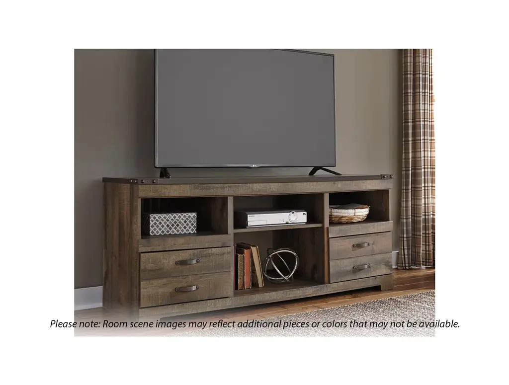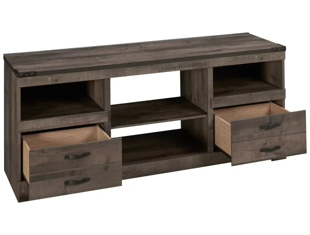 Update your entertainment space with the Ashley Trinell TV Stand. Its sturdy construction and spacious top can support your favorite TV, while the four shelves and two drawers offer storage space for your media devices and equipment. Wire cutouts at the back help you manage your electronics. The natural brown weathered texture of its exterior is accentuated by metallic corners, nailheads, and metallic drawer pulls to complete the rustic look of this contemporary-style TV stand.