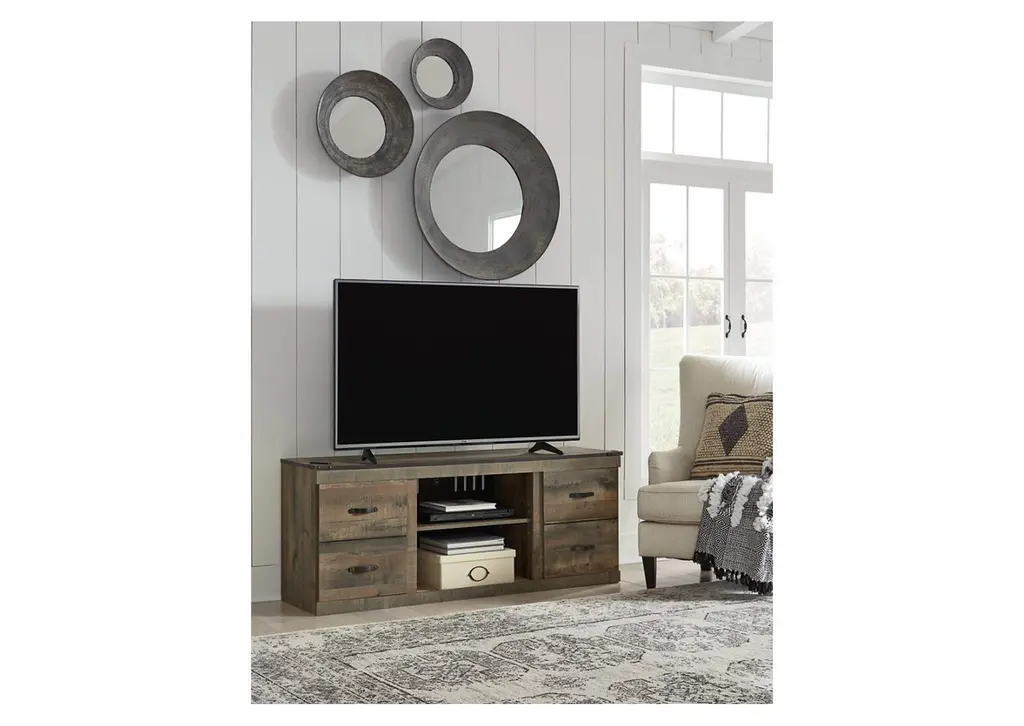Entertain a rugged-yet-refined sense of style with the Trinell TV stand. Its rustic finish and plank-style details pay homage to reclaimed barn wood, while bronze-tone banding with nailhead accents infuses a touch of industrial cool. Ultraclean lines ensure a look that can go from the country to the city and feel equally at home. Opt for the optional fireplace insert (sold separately) for added warmth. Weight 96.000 lbs. (43.2kgs.)