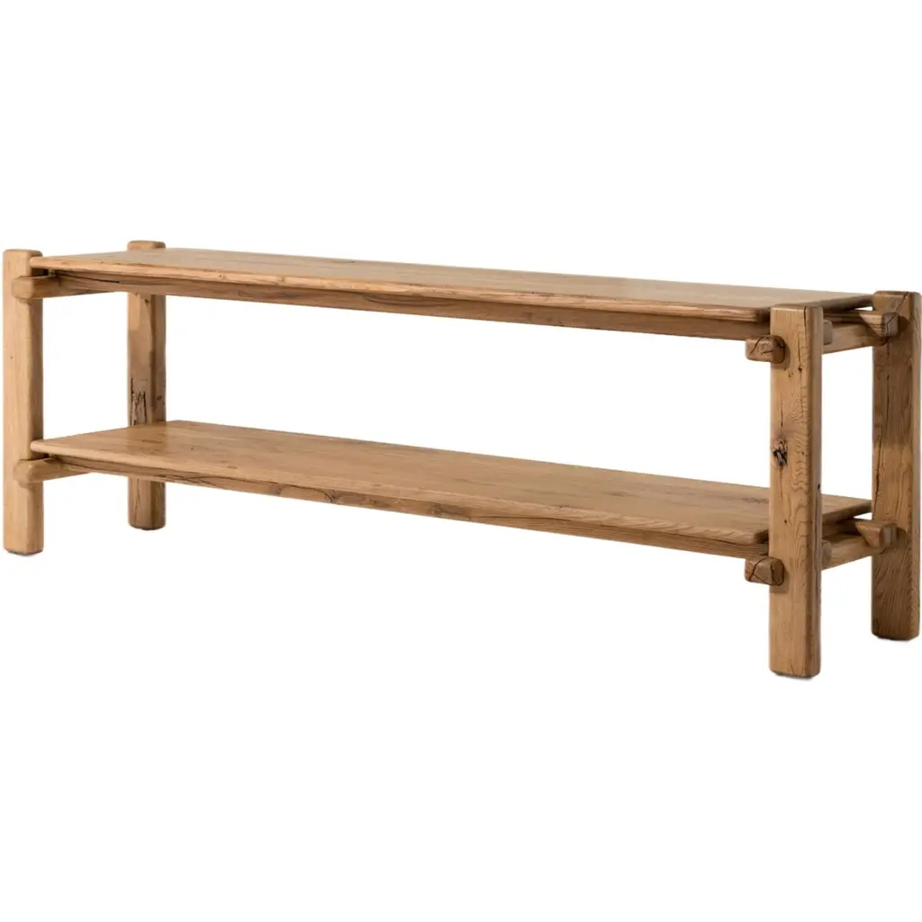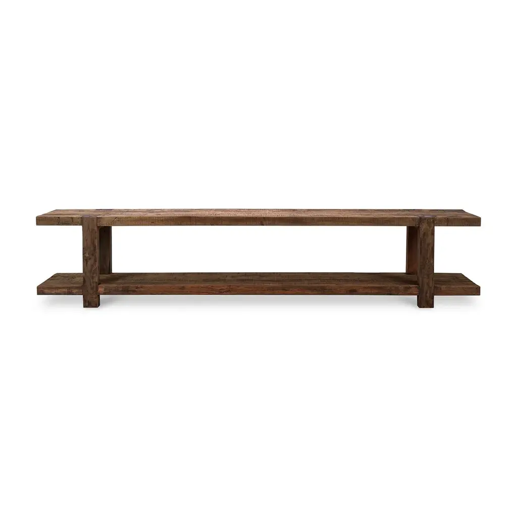 A perfect blend of functionality and natural beauty. Crafted from high-quality teak wood, this TV stand features a rich, earthy Tuscan finish that highlights the wood's natural grain and texture. The rustic design adds warmth and character, making it a standout piece in any decor. The open shelves are perfect for showcasing your media devices, decor items, or books, while the drawers provide concealed storage for remotes, cables, and other essentials. Dimensions: 94" W x 16" D x 20" H