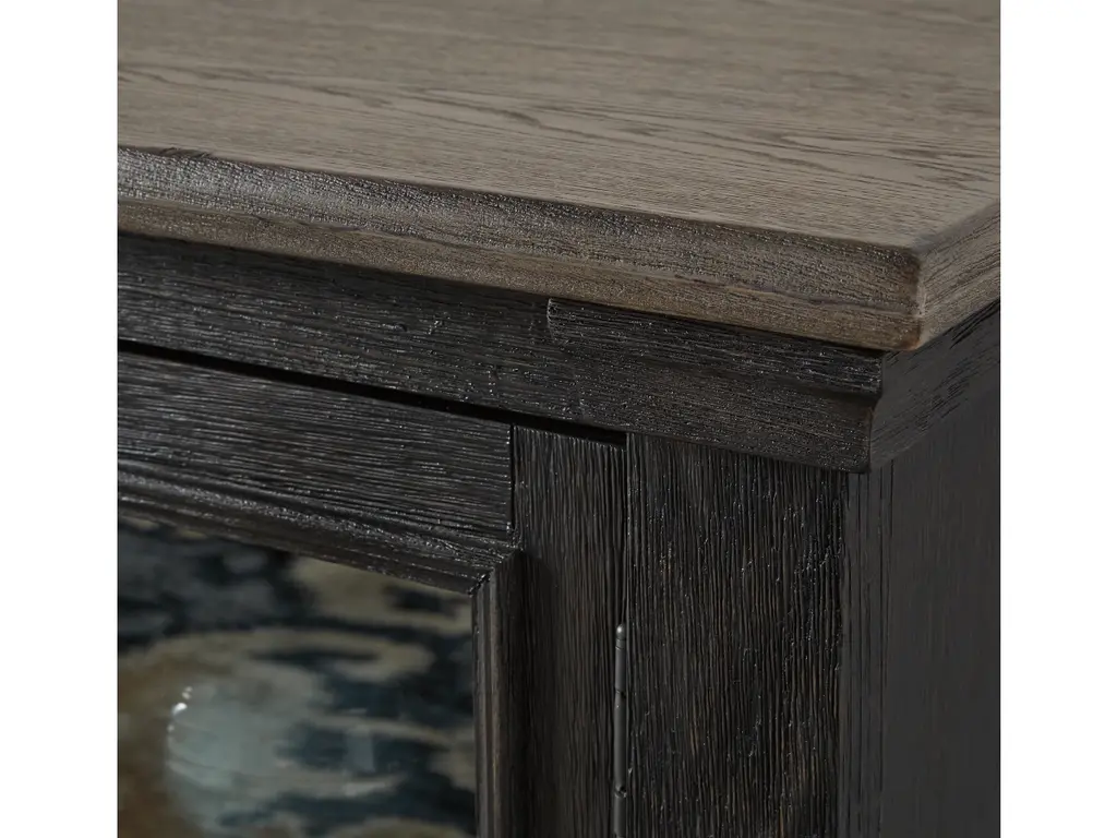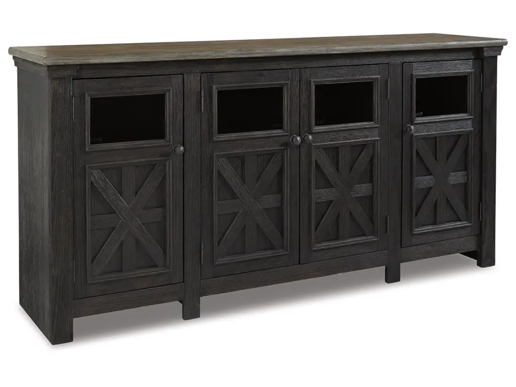 Shabby chic with a hint of down-home country, the Tyler Creek TV stand appeals to today’s more relaxed sensibilities. Its richly rustic two-tone effect blends a textured black finish with a weathered gray-brown top for an easy-elegant aesthetic. Framed doors with crossbuck detailing and clear glass insets bring a touch of modern farmhouse to the scene.