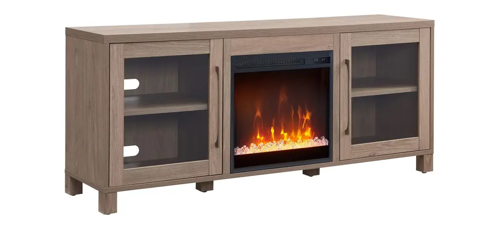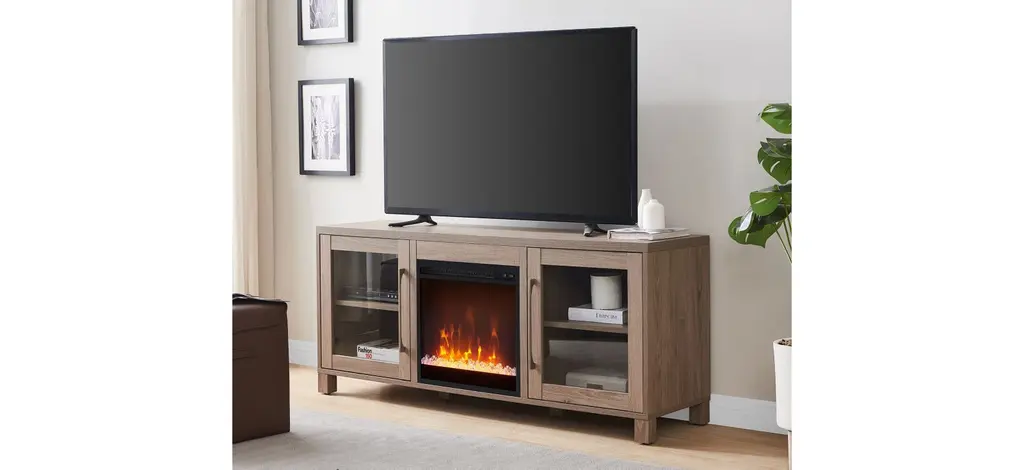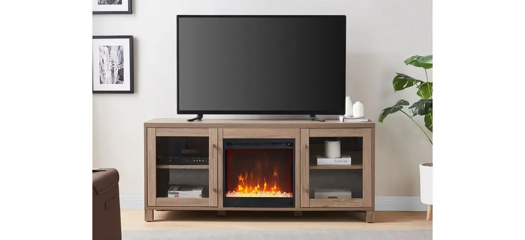 Combine functionality and classic contemporary design with the Ursula TV Stand, featuring an inset electric fireplace. Its rich wood tone creates a warm neutral palette that will blend seamlessly into any color scheme, while its glass-doored side cabinets allow for plenty of storage. Cable management cut-outs and adjustable inner shelves help keep your media storage and consoles organized. Stay warm and cozy while you take in the big game, a movie marathon, or that season finale everyone’s been talking about.