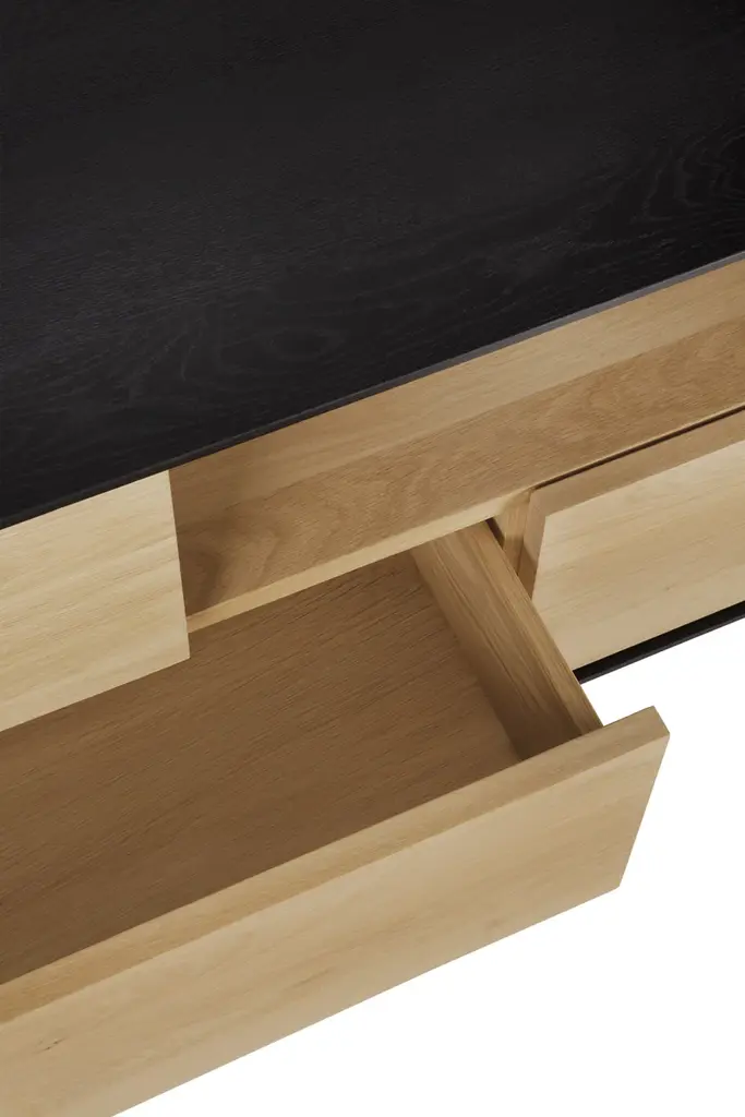 The Varnished Oak Media Unit by Ethnicraft is a stylish and practical piece to organize your entertainment area. This Blackbird TV cupboard features a push-open door, a convenient flip-down door, and two sleek push-open drawers. Crafted from solid oak, black-stained solid oak, and supported by sleek black metal legs, it exudes a seamless blend of style and functionality. Download Technical Line DrawingDownload Care Instructions