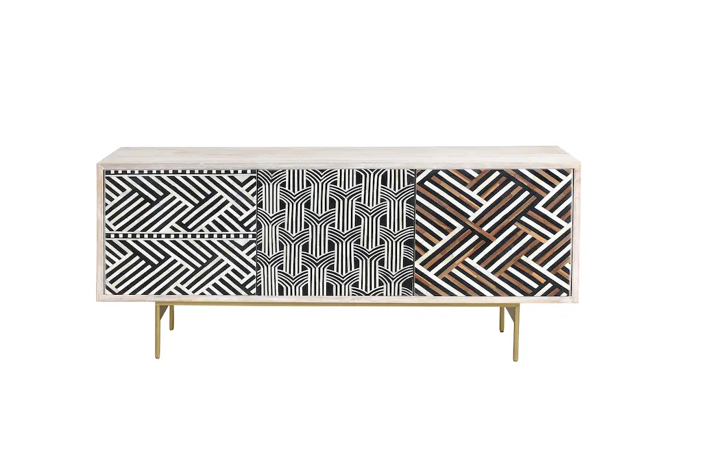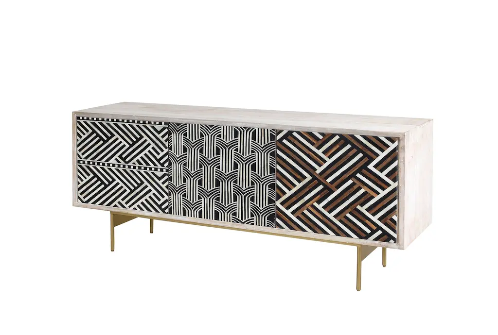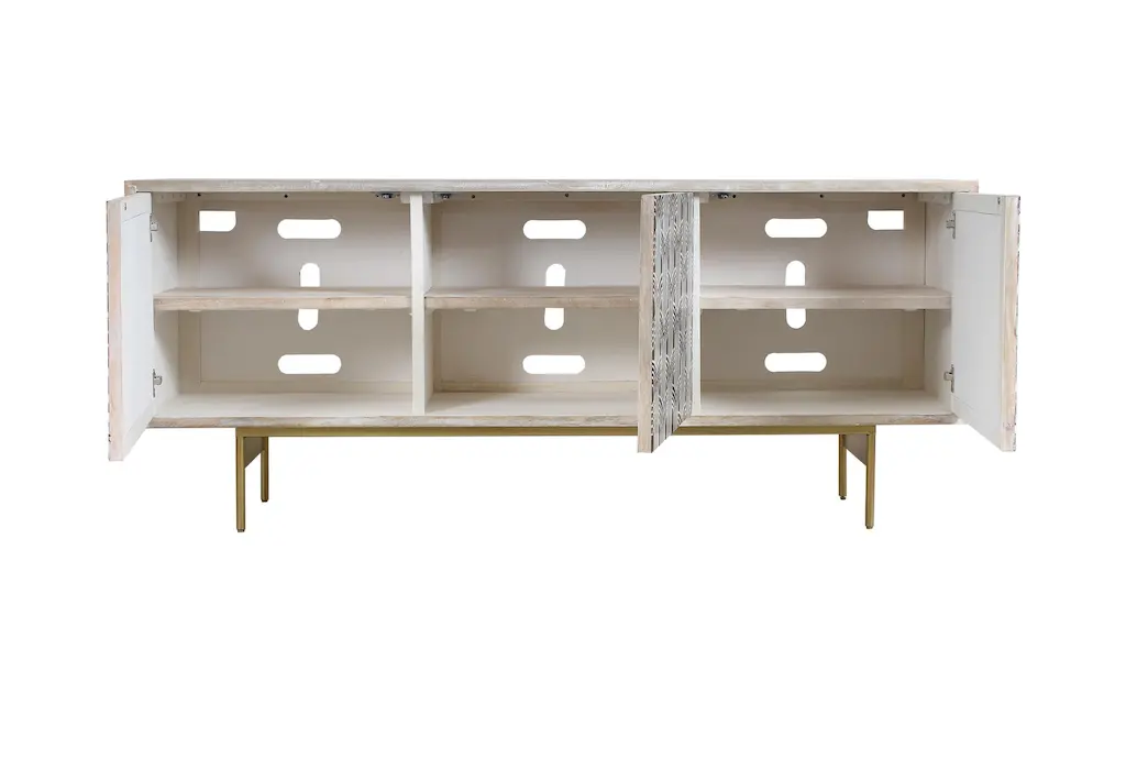 The Veda White Wash 72" Modern TV Stand is a stunning addition to any living space, blending boho charm with modern design. Crafted from solid mango wood with intricate bone inlay, this entertainment center offers both style and functionality. Its white washed natural finish and polychromatic patterns make it a standout piece for your family room or great room.