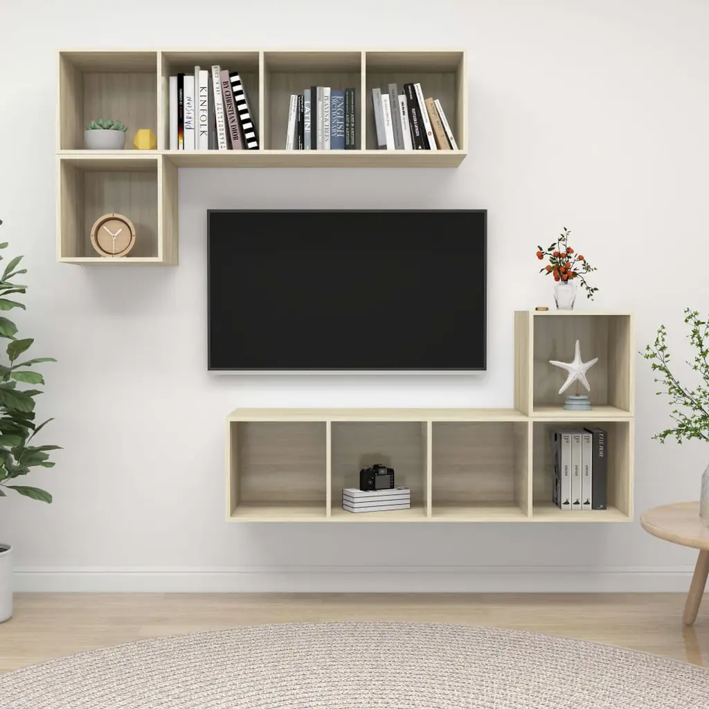 This Sonoma Oak 4-Piece TV Cabinet Set is a smart pick for modern living rooms. It combines practicality and style, making it a fantastic focal point. This cabinet set offers plenty of storage for your entertainment gear while looking amazing with its smooth finish and natural oak color. Plenty of storage thanks to four shelves for various items.Wall-mounted design to save space.Made from durable engineered wood for long-lasting use.Matte finish for a modern, non-reflective look.Perfect for living rooms, entertainment centers, or display use.