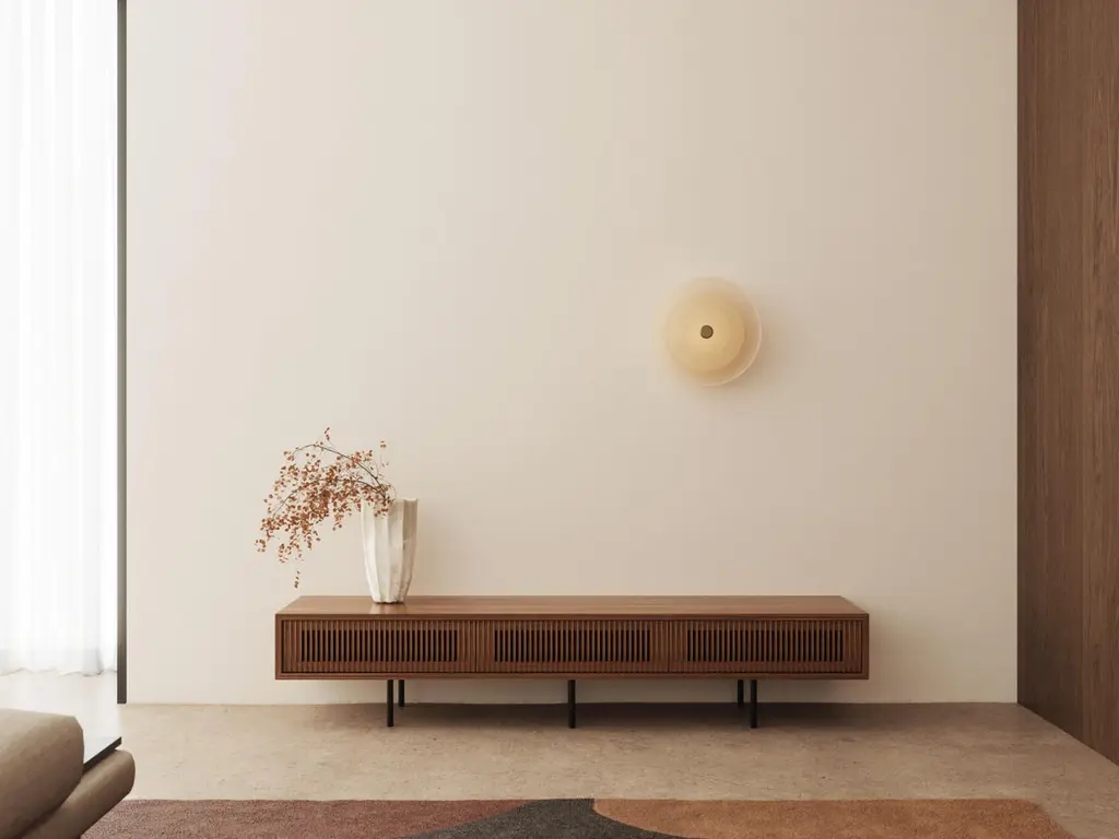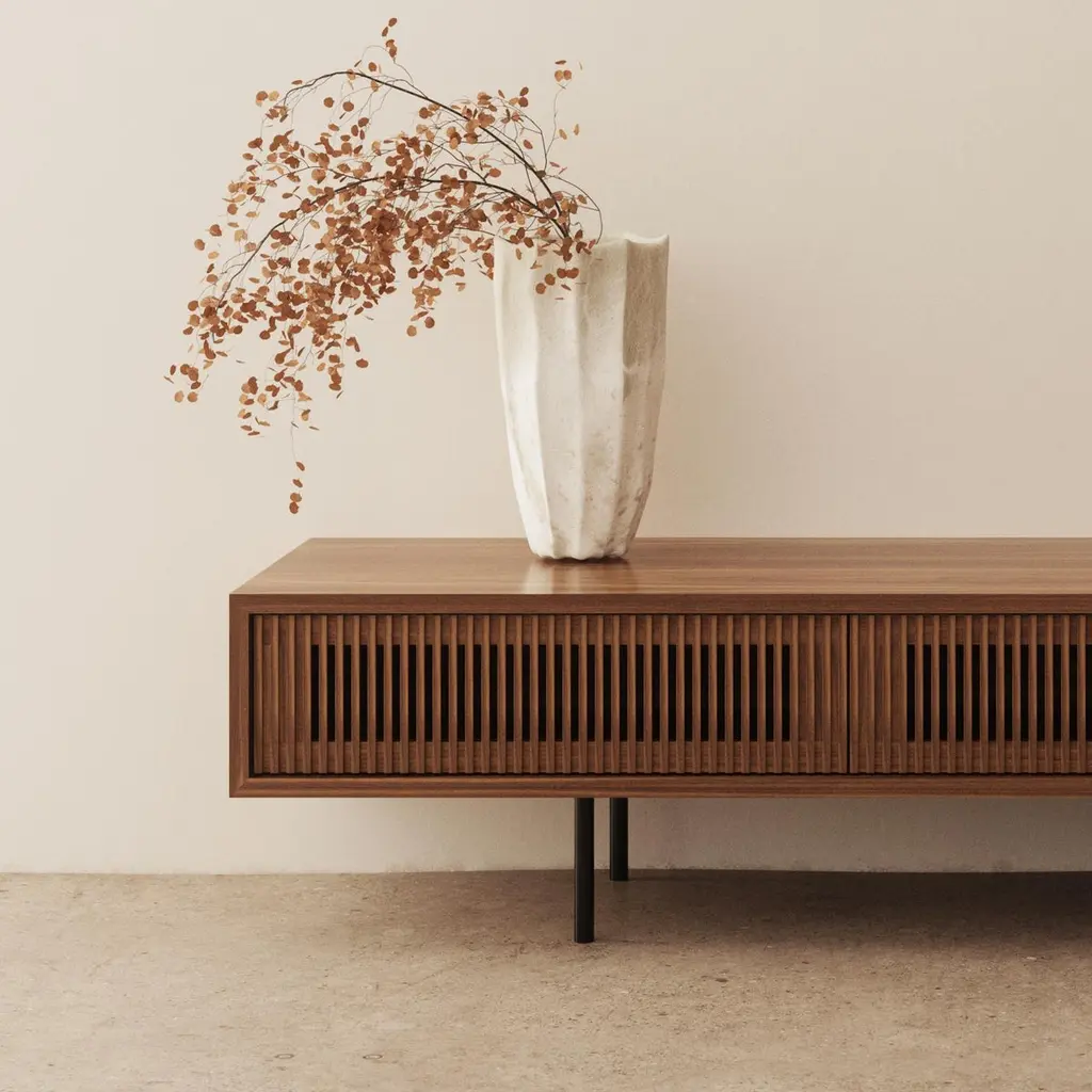 Walnut Tv Stand Lowboard With Three Slatted Doors In Mid Century Modern Style