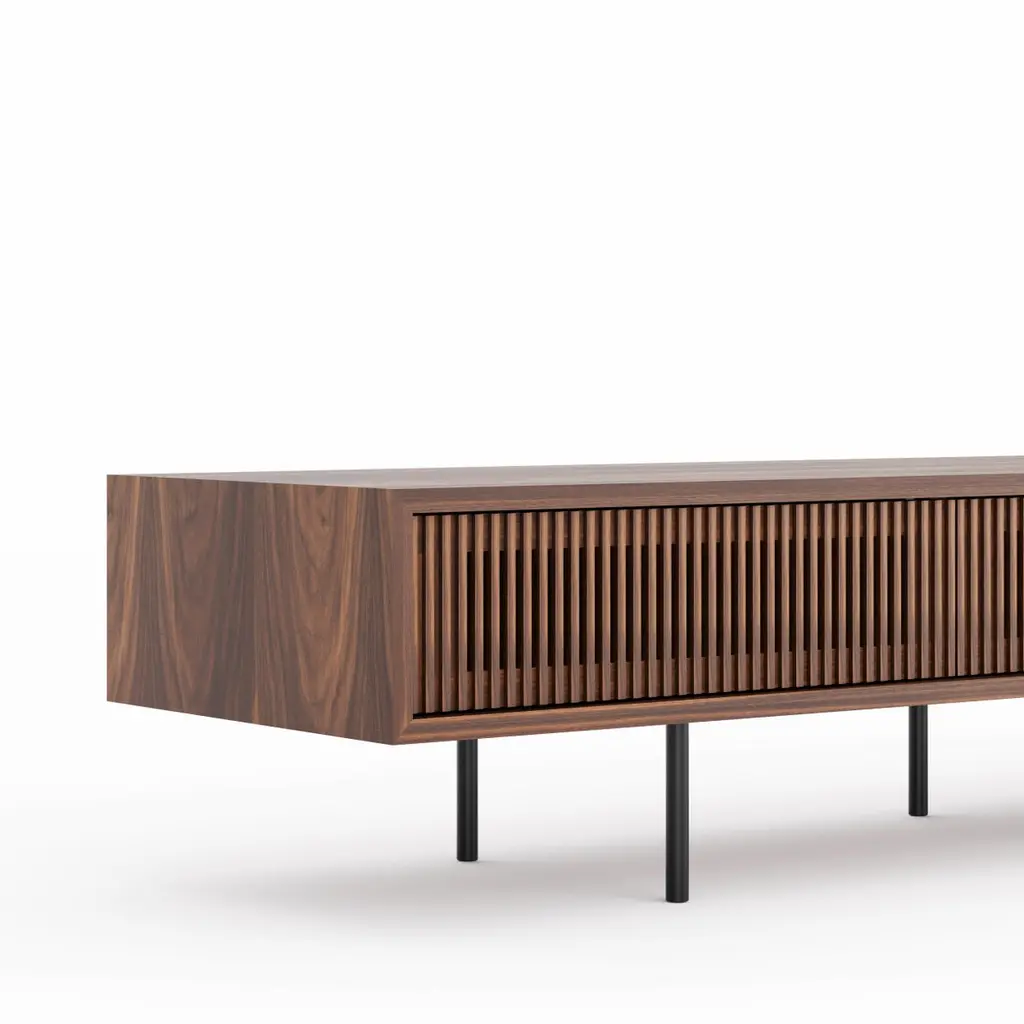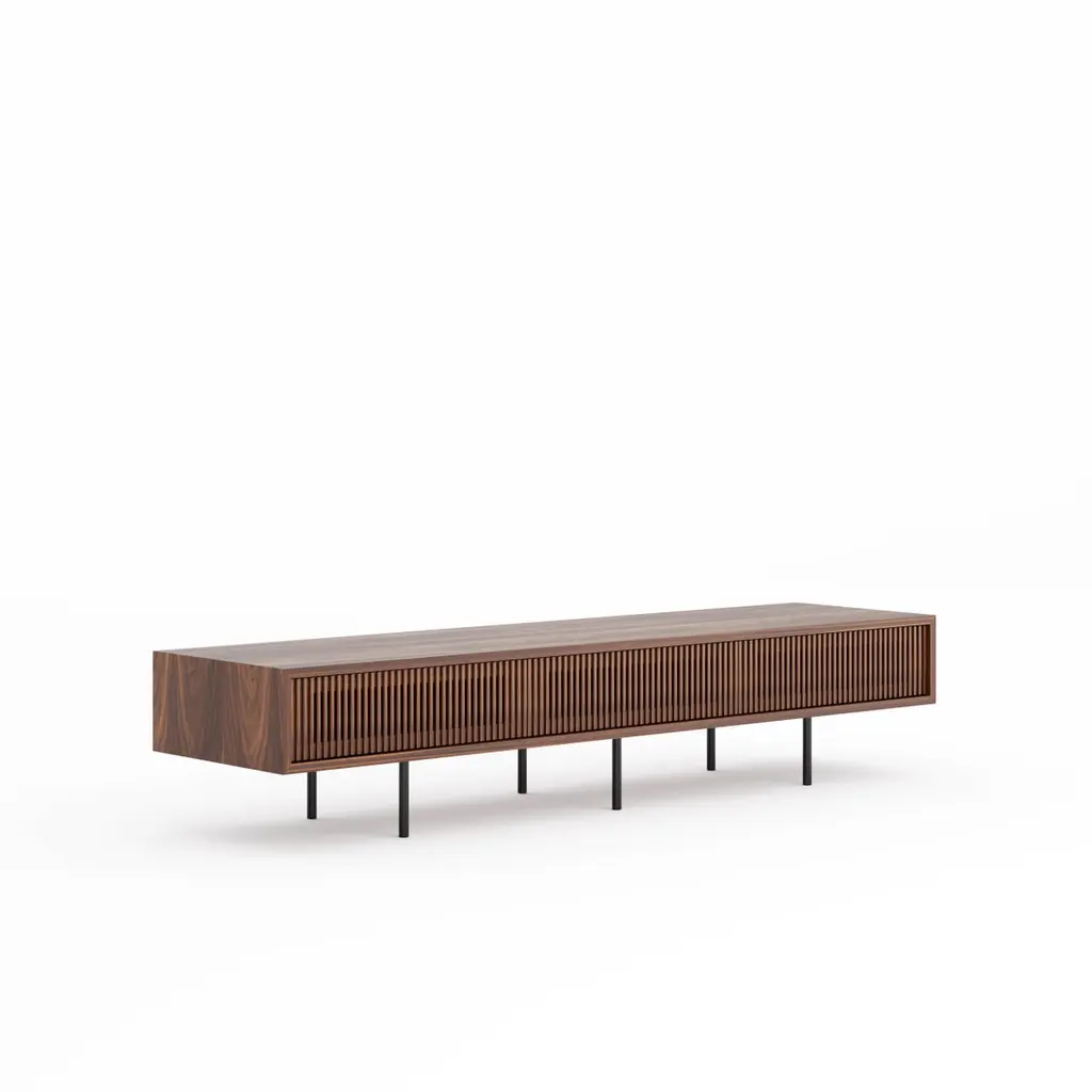 Walnut lowboard with three slatted doors and simple aluminum black legs in mid century modern style.Perfect as a TV stand or media console for music enthusiasts. Lot of storage space to accommodate media equipment and accessories.Lowboard made of solid American walnut wood and wood covered with natural American walnut veneer.Cable hole behind middle slatted door + holes in the compartments to allow for easy cable routing. Six straight, black lacquered aluminum legs.Handmade in Poland.Dimensions:width: 150 cm or 180 cm or 200 cm or 220 cmdepth: 45 cmtotal height: 36 cmlegs height: 16cmMaterial used:structure: blockboard overlaid with American walnut veneerfronts: solid American walnut. Push to open.base: black aluminumcable hole: black aluminumWood finishing: high quality matte varnish.Made to order. Lead time: 9-10 weeksYou can change the size, material, surface treatment after prior contact and setting prices.