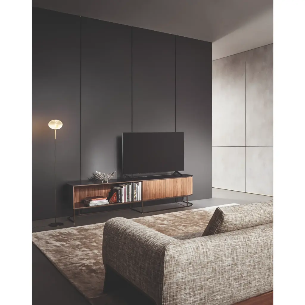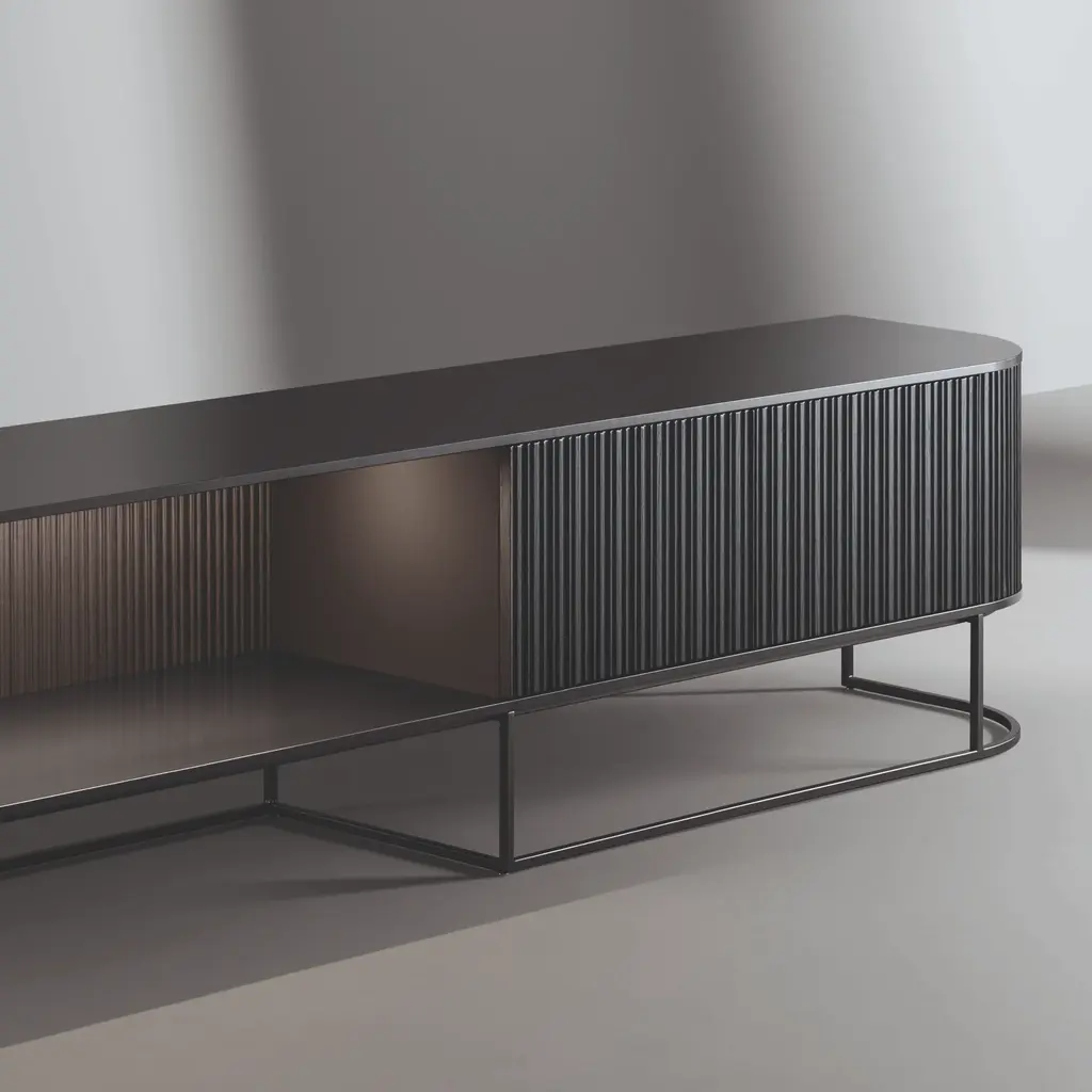 Like the sideboard of the same family, the Dune TV cabinet is notable for a wavy wooden surface that creates an interplay of light and shadow. In this version the structure alternates an “empty" area, in which books or decorative objects can be stored, and a “full" section closed by a door. The Dune TV stand is available in two fixed color combinations (Canaletto walnut and bronze or carbon oak and lead), with metal base or plinth. In the Dune TV stand light version there is an integrated system of lights giving a backlit effect.