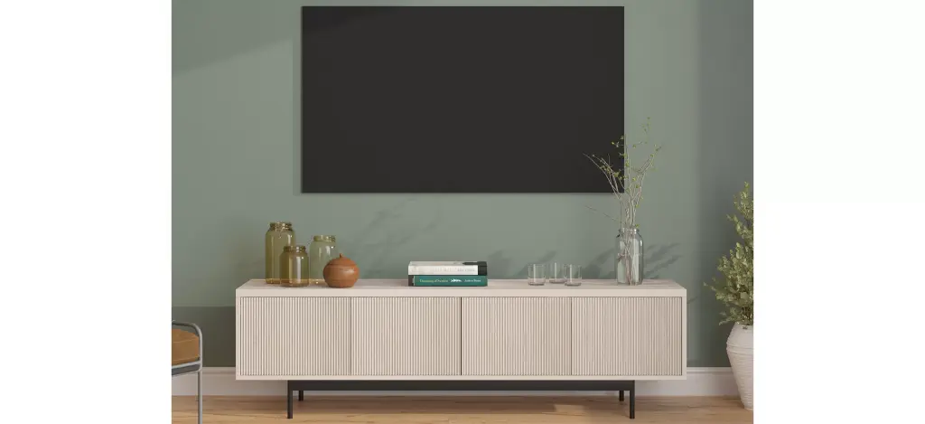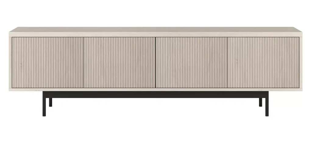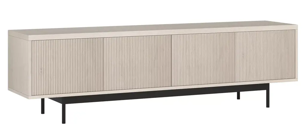 On-trend texture and design combine in this modern Whitman TV Stand . With a wood grain finish and textured doors, this piece is perfect for your mid-century or minimalist-inspired living room, den, or game room. It's low 20" height leaves plenty of room above for an oversized wall-mounted TV or set of statement lamps. This stand features cable-management cut-outs and 4 fully enclosed doors with an open inside area, allowing for free-form storage of your devices, games, books, and more.