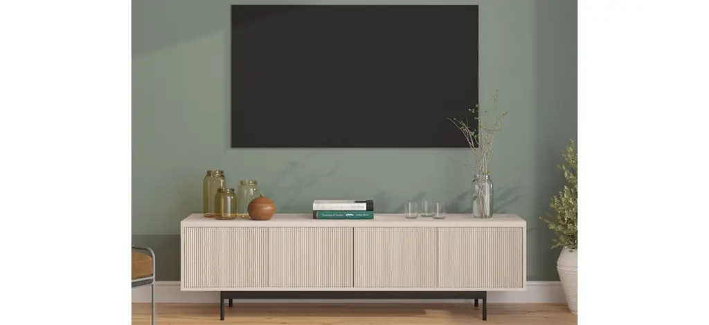 On-trend texture and design combine in this modern Whitman TV Stand . With a wood grain finish and textured doors, this piece is perfect for your mid-century or minimalist-inspired living room, den, or game room. It's low 20" height leaves plenty of room above for an oversized wall-mounted TV or set of statement lamps. This stand features cable-management cut-outs and 4 fully enclosed doors with an open inside area, allowing for free-form storage of your devices, games, books, and more.