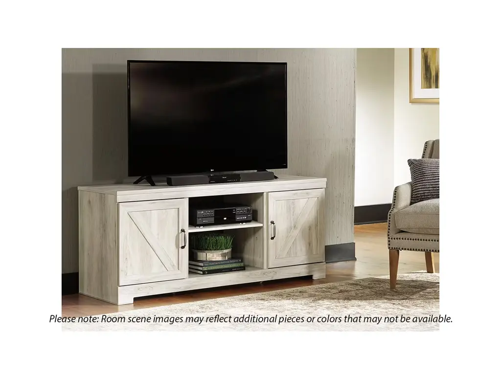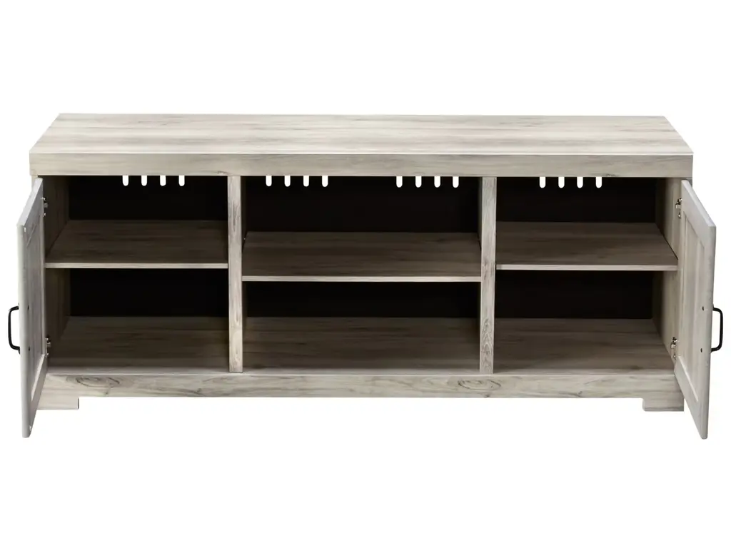 Give your living space a country-chic look with the Ashley Bellaby TV Stand. This contemporary-style home furniture features clean lines with two barn-inspired doors opened by antique brass hardware. The removable, adjustable shelves give you many storage and display options, and there are cutouts at the back for wire management and ventilation. Available in other finishes.