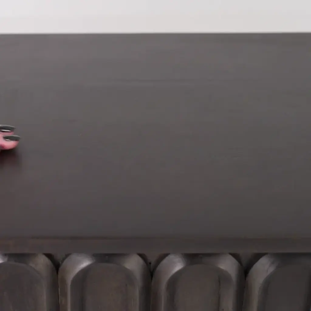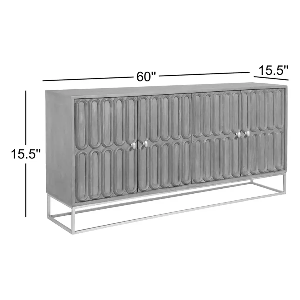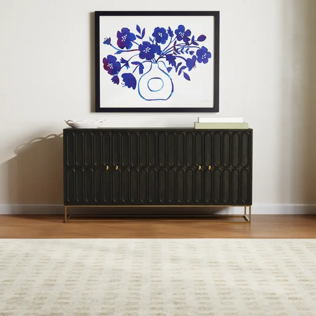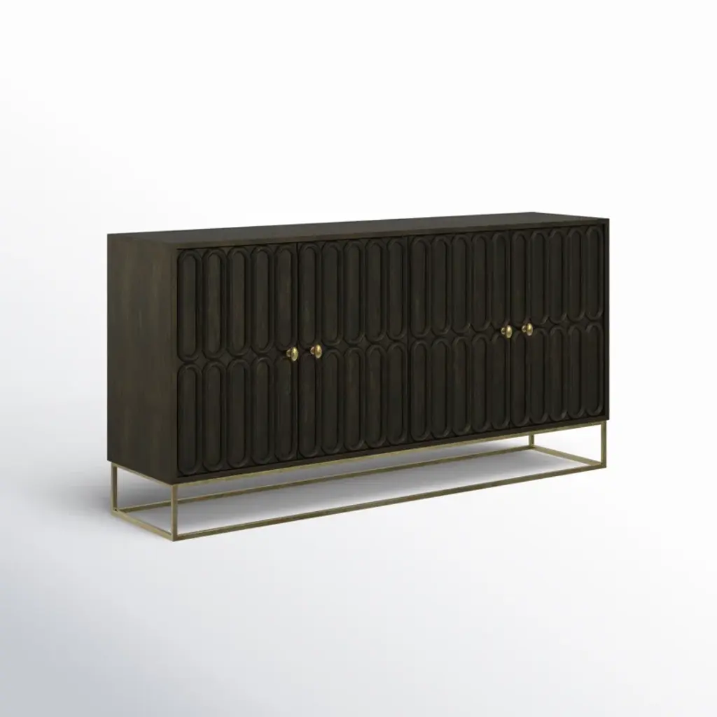 Bring a touch of classic sophistication and contemporary style to your home with this beautifully designed console. Featuring a bold Special Reserve finish and artfully carved door fronts, this piece commands attention while offering functional storage. Crafted from select solids and veneers, each door showcases two rows of raised race-course oval carvings, lending a rich, textured look. A sleek brass finished metal base and matching door pulls add a touch of modern glam, while interior shelving behind each door provides plenty of space to tuck away electronics, books, or decor. It's the perfect blend of classic detailing and modern design to elevate any room.