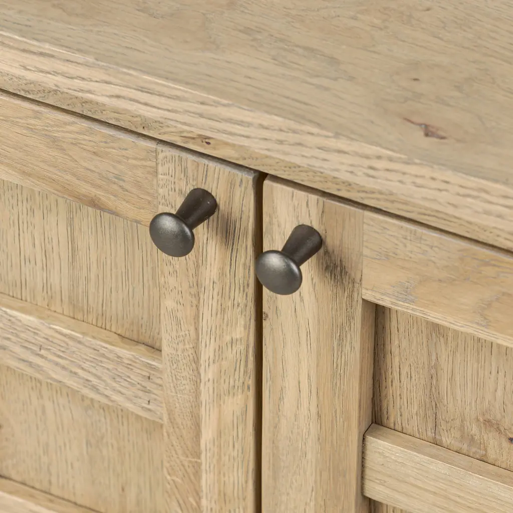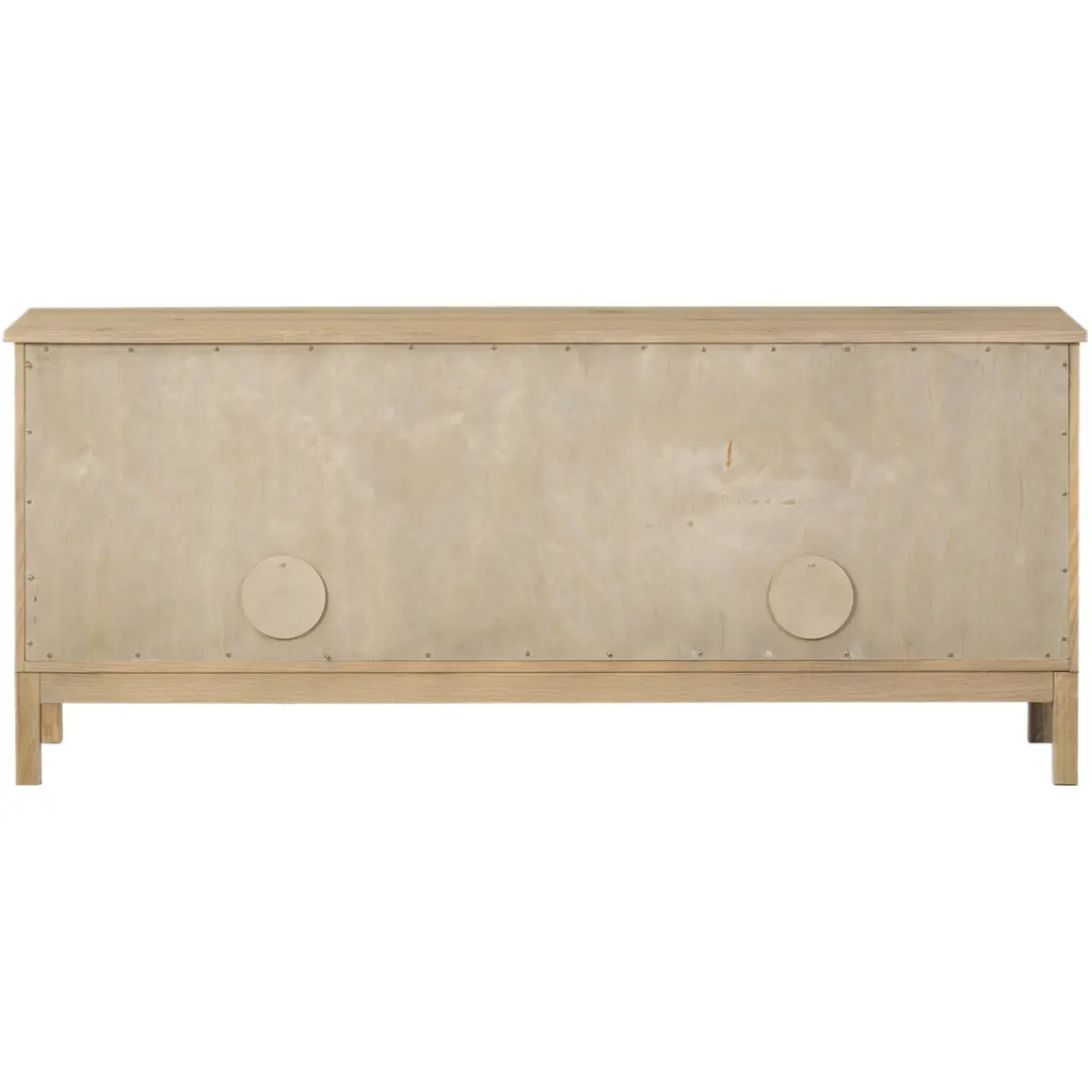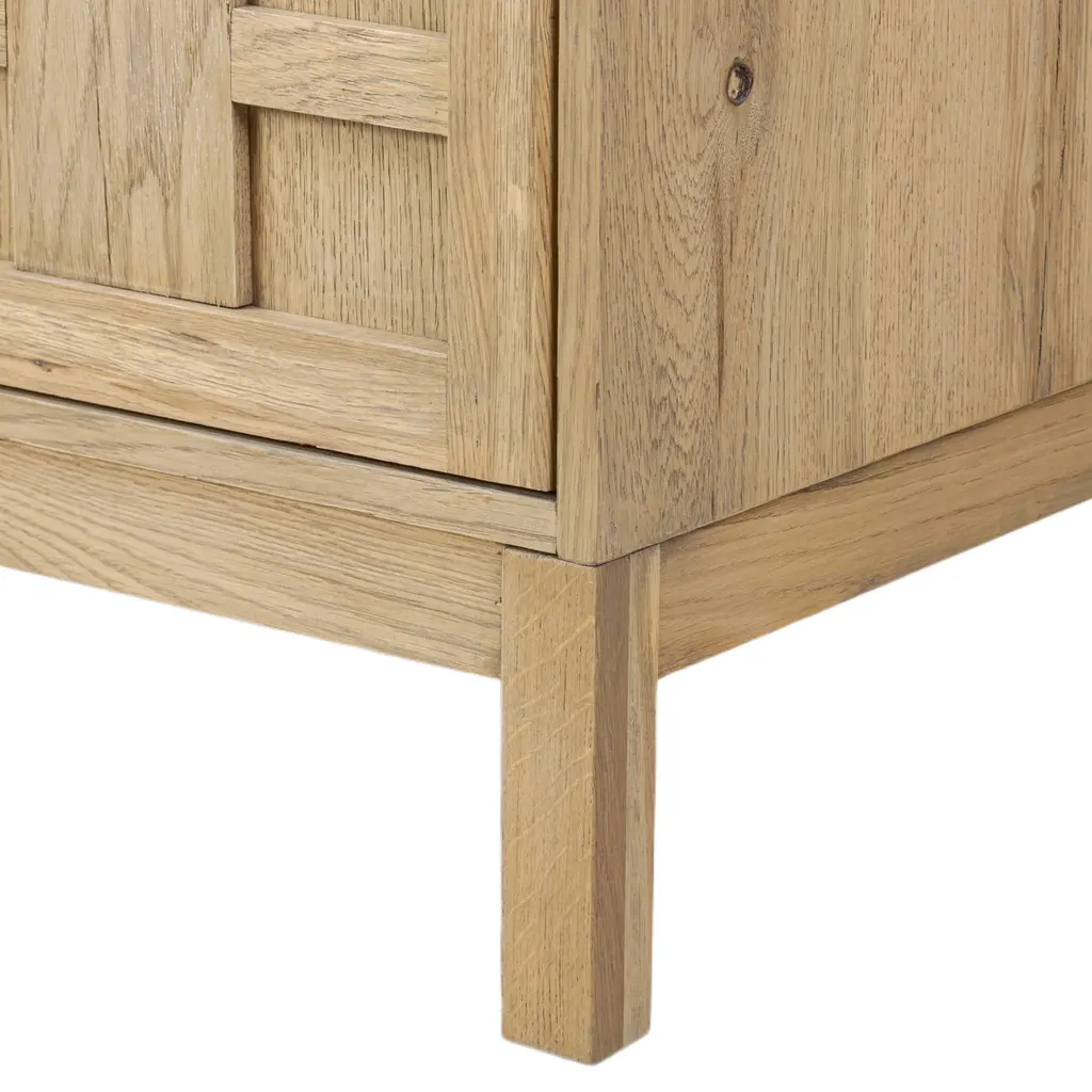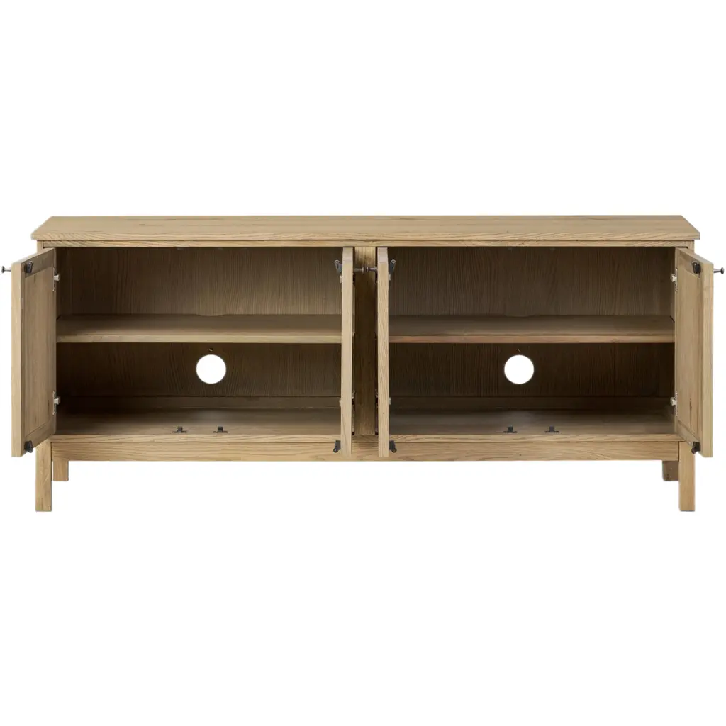 The Yvonne Media Console is a transitional piece that seamlessly integrates into your collection. Crafted from oak, it showcases natural graining, knots, and cracks that highlight the rich character of the wood, making each piece truly unique. Grid-like patterned doors add dimension to its clean, simple lines, while interior shelving provides ample storage for media, dinnerware, linens, and more. Thoughtfully designed with rear cutouts for cord management, this console blends timeless style with functional versatility.