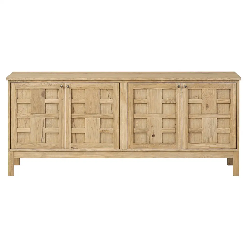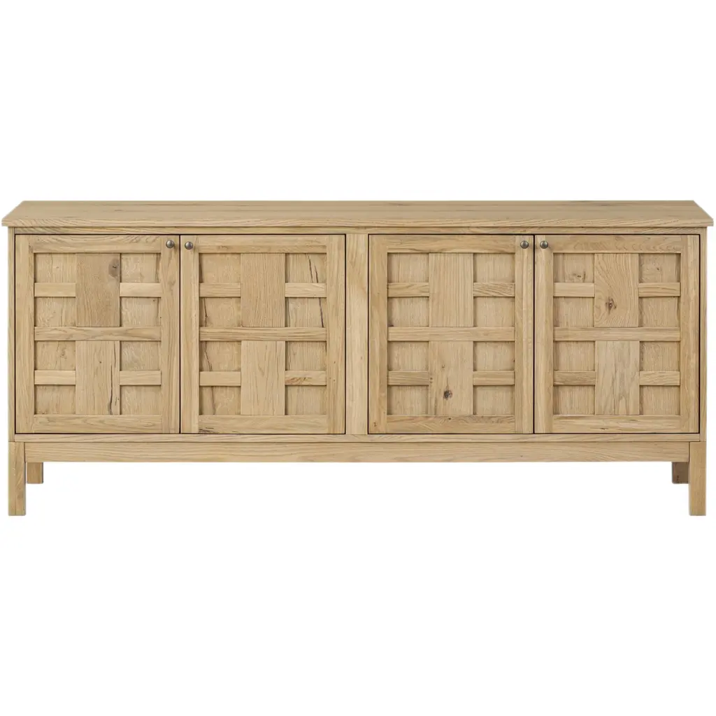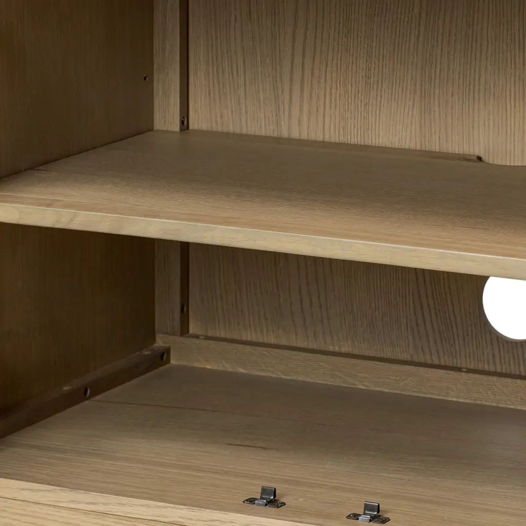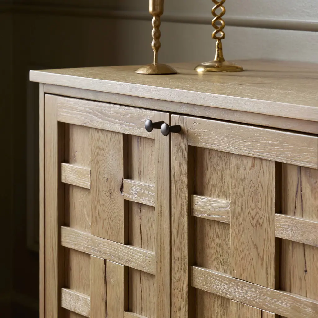 The Yvonne Media Console is a transitional piece that seamlessly integrates into your collection. Crafted from oak, it showcases natural graining, knots, and cracks that highlight the rich character of the wood, making each piece truly unique. Grid-like patterned doors add dimension to its clean, simple lines, while interior shelving provides ample storage for media, dinnerware, linens, and more. Thoughtfully designed with rear cutouts for cord management, this console blends timeless style with functional versatility.