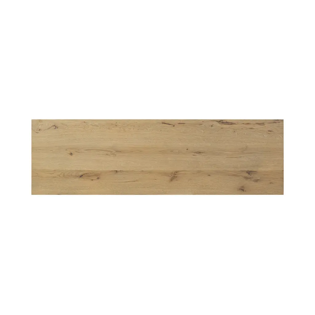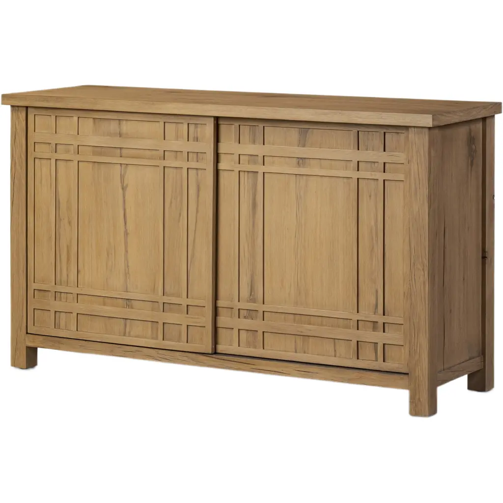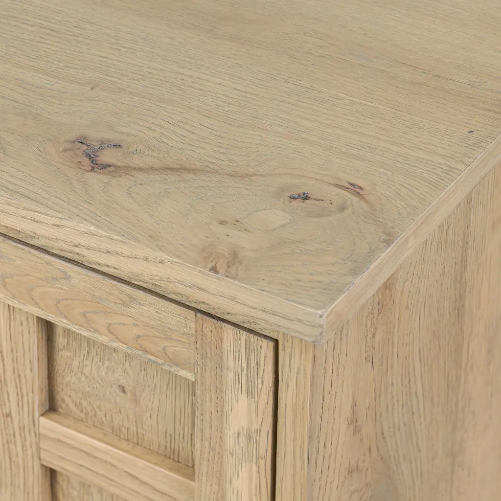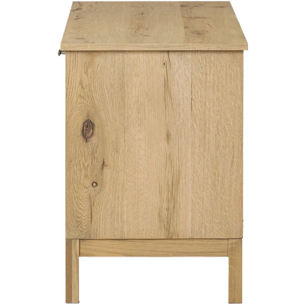 The Yvonne Media Console is a transitional piece that seamlessly integrates into your collection. Crafted from oak, it showcases natural graining, knots, and cracks that highlight the rich character of the wood, making each piece truly unique. Grid-like patterned doors add dimension to its clean, simple lines, while interior shelving provides ample storage for media, dinnerware, linens, and more. Thoughtfully designed with rear cutouts for cord management, this console blends timeless style with functional versatility.