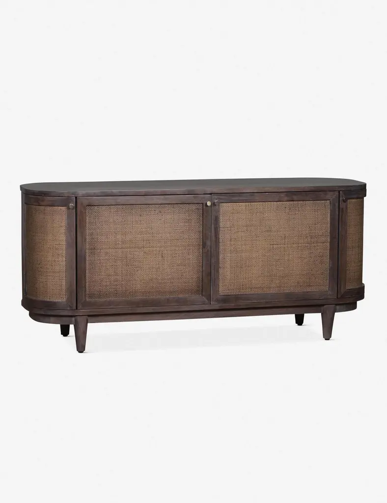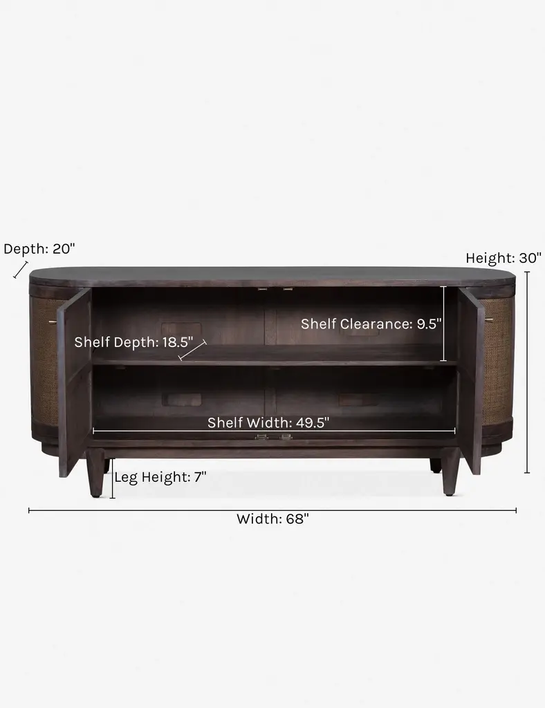 A transitional storage piece with plenty of character. Finished with curved ends and caned door fronts, this wooden media console has a stately look that doesn't overpower your space.
