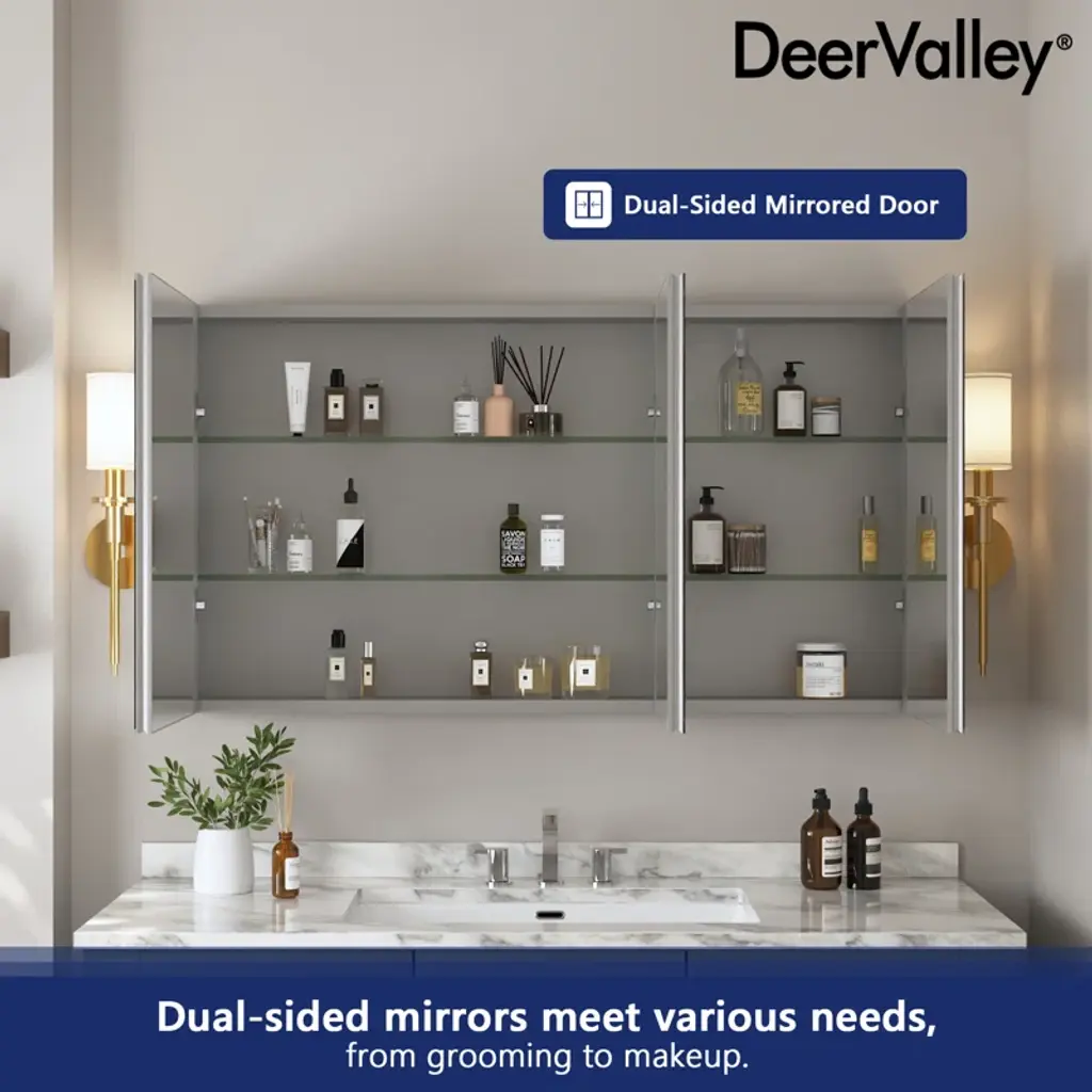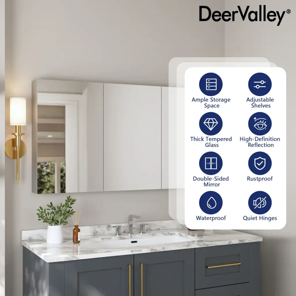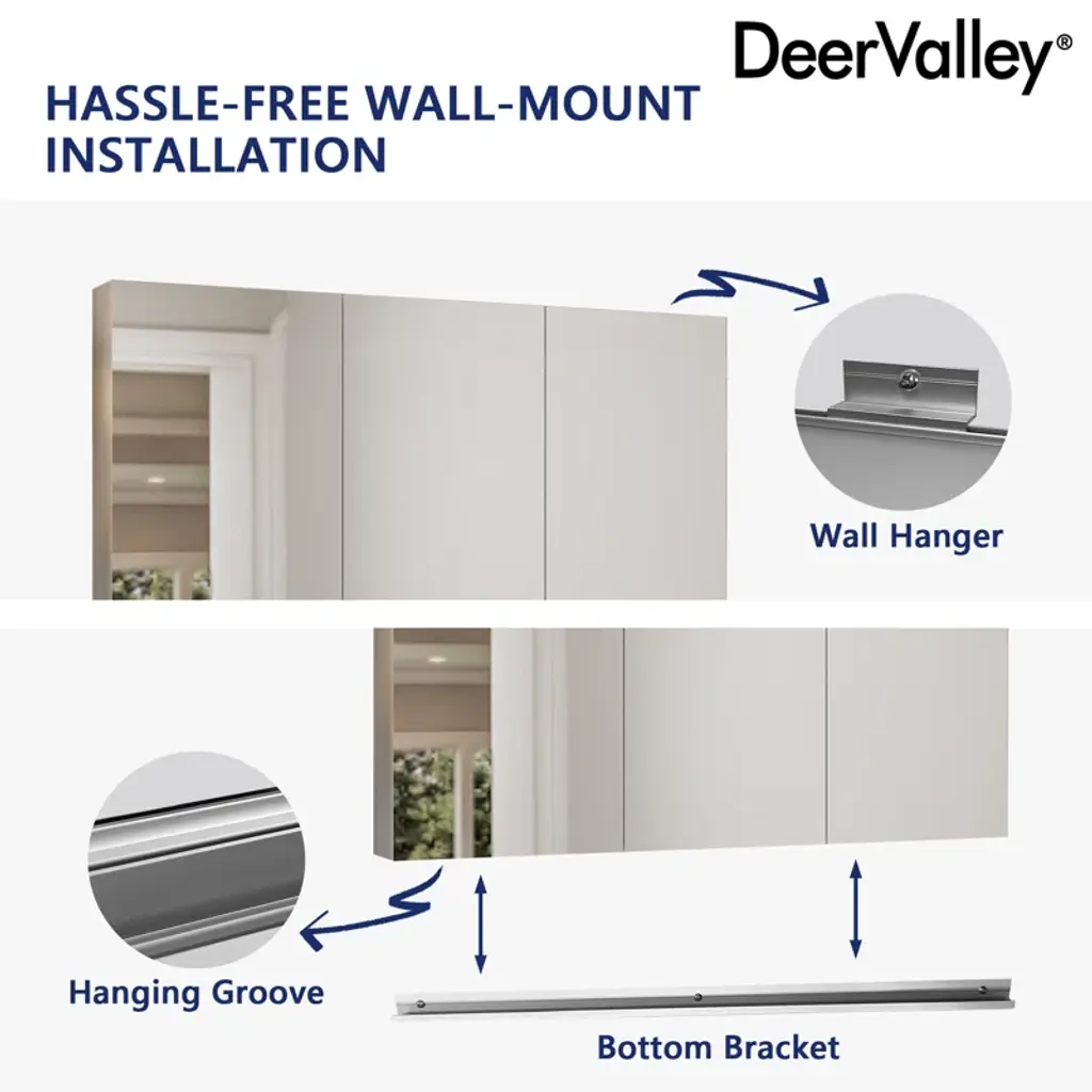 The DeerValley medicine cabinet is equipped with three doors, each featuring mirrors on both sides. This design allows you to open the cabinet and access your makeup while keeping an eye on your appearance. The cabinet offers two adjustable shelves, providing convenient storage for items such as hair products, toothbrushes, medication, cosmetics, and other essential supplies, helping you maintain a clutter-free countertop. It arrives at your doorstep pre-assembled and carefully packaged to ensure a safe and intact delivery. For easy installation, the cabinet can be surface mounted directly to a wall. Its design is suited for various settings as it meets the requirements for use in damp environments.