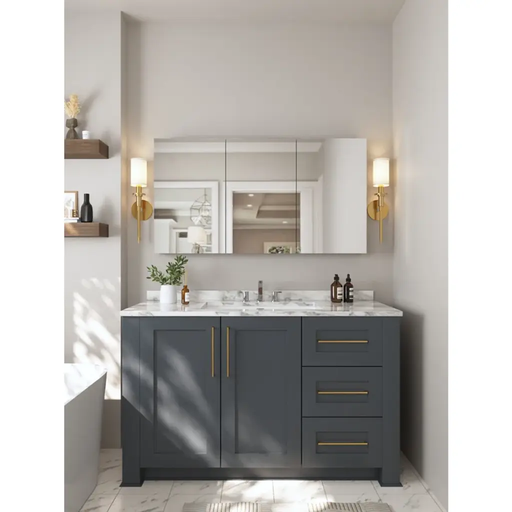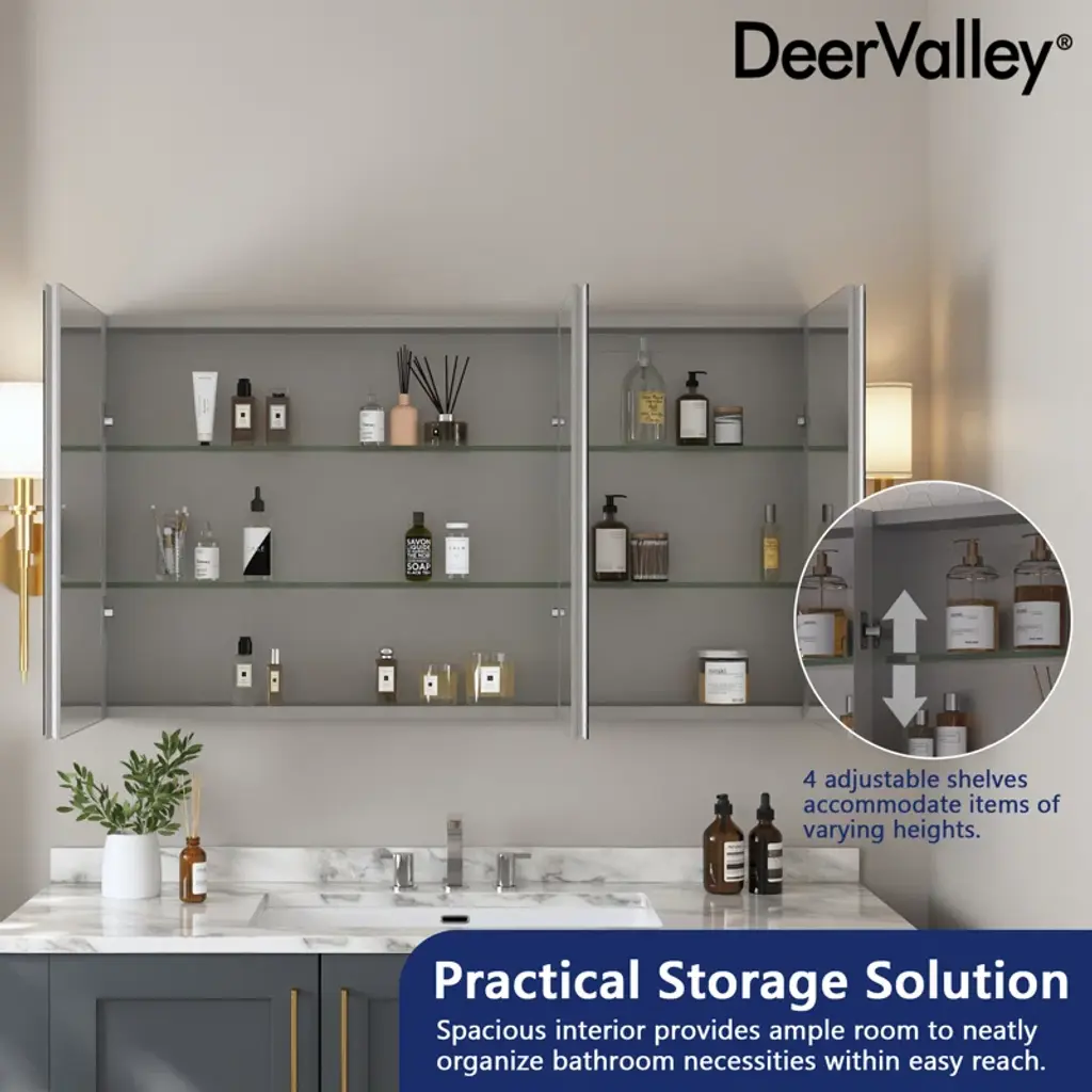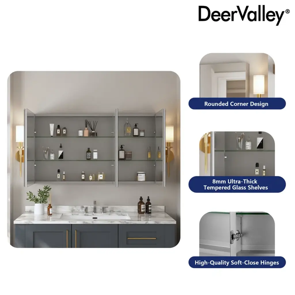 The DeerValley medicine cabinet is equipped with three doors, each featuring mirrors on both sides. This design allows you to open the cabinet and access your makeup while keeping an eye on your appearance. The cabinet offers two adjustable shelves, providing convenient storage for items such as hair products, toothbrushes, medication, cosmetics, and other essential supplies, helping you maintain a clutter-free countertop. It arrives at your doorstep pre-assembled and carefully packaged to ensure a safe and intact delivery. For easy installation, the cabinet can be surface mounted directly to a wall. Its design is suited for various settings as it meets the requirements for use in damp environments.