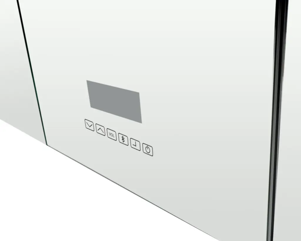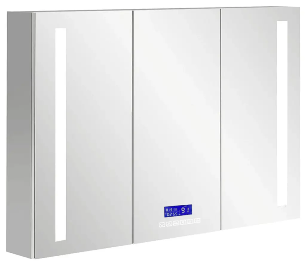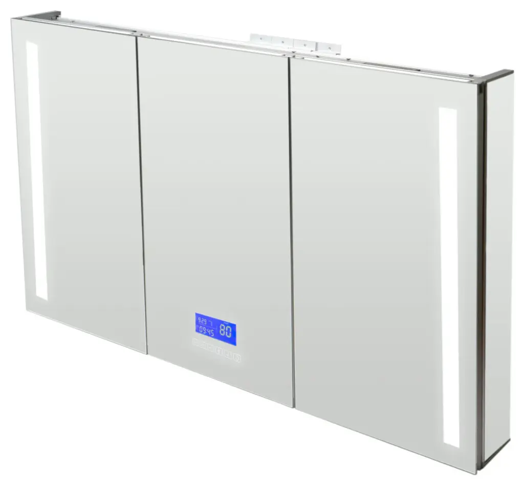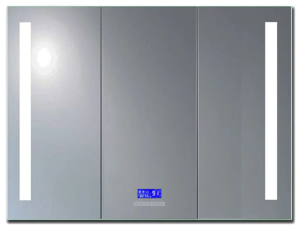 Featuring bluetooth connectivity for playing music through the built in speakers. Digital clock and room temperature shown on the screen. Defogger function makes sure that your mirror won''t fog up no matter how long of a shower you take :)Includes 4 adjustable height 1/4" thick (6mm) tempered glass shelves that are 3 1/8" (80mm) deep.Wall mounting hardware included. Hardwire connection to power without a plug.High quality aluminum cabinet body covered with mirrors inside and out.Includes electrical outlet with two standard plugs and 2 USB plugs.The defogger and the light turn on/off together on the same switch. So if the light is on, the defogger will be on as well.Energy efficient 3,200 lumens LED lighting strip. With a light temperature of 6,500k which is very white.Triple swinging door with mirror on both sides. Soft self closing door hinges by the top quality DTC brand.UL approved electrical components. Meets IP44 waterproof standard.