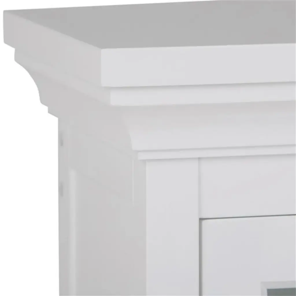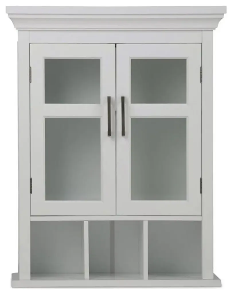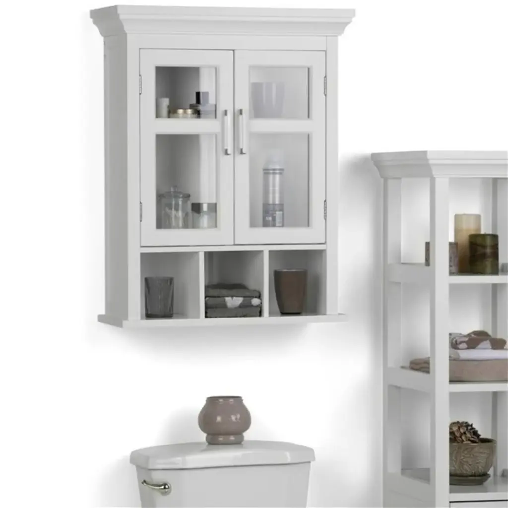 Like to have a little more space in your bathroom? This Simpli Home stylish wall cabinet gives you just that, with two doors opening to an adjustable shelf and three open cubbies. Fill it up with all of the toiletries that you normally have on the counter and your bathroom will look uncluttered and spacious.Features: • Finish: Pure White • Constructed using Rubberwood, Engineered Wood and Tempered Glass • Durable Pure White painted finish sealed with a premium NC lacquer coating • Features two (2) doors with one (1) adjustable interior shelf and three (3) open cubbies. Contemporary Brushed Nickel handles • Shaker styled front and side panels with molded top detail, Rubber wood frame • Contemporary styling, Mounting hardware included • Assembly required • Efforts are made to reproduce accurate colors, variations in color may occur due to computer monitor and photography • At Simpli Home we believe in creating excellent, high quality products made from the finest materials at an affordable price • Every one of our products come with a 1-year warranty and easy returns if you are not satisfiedSpecifications: • Product Dimensions: 30" H x 23.6" W x 10" D • Weight Capacity: 35 lbs