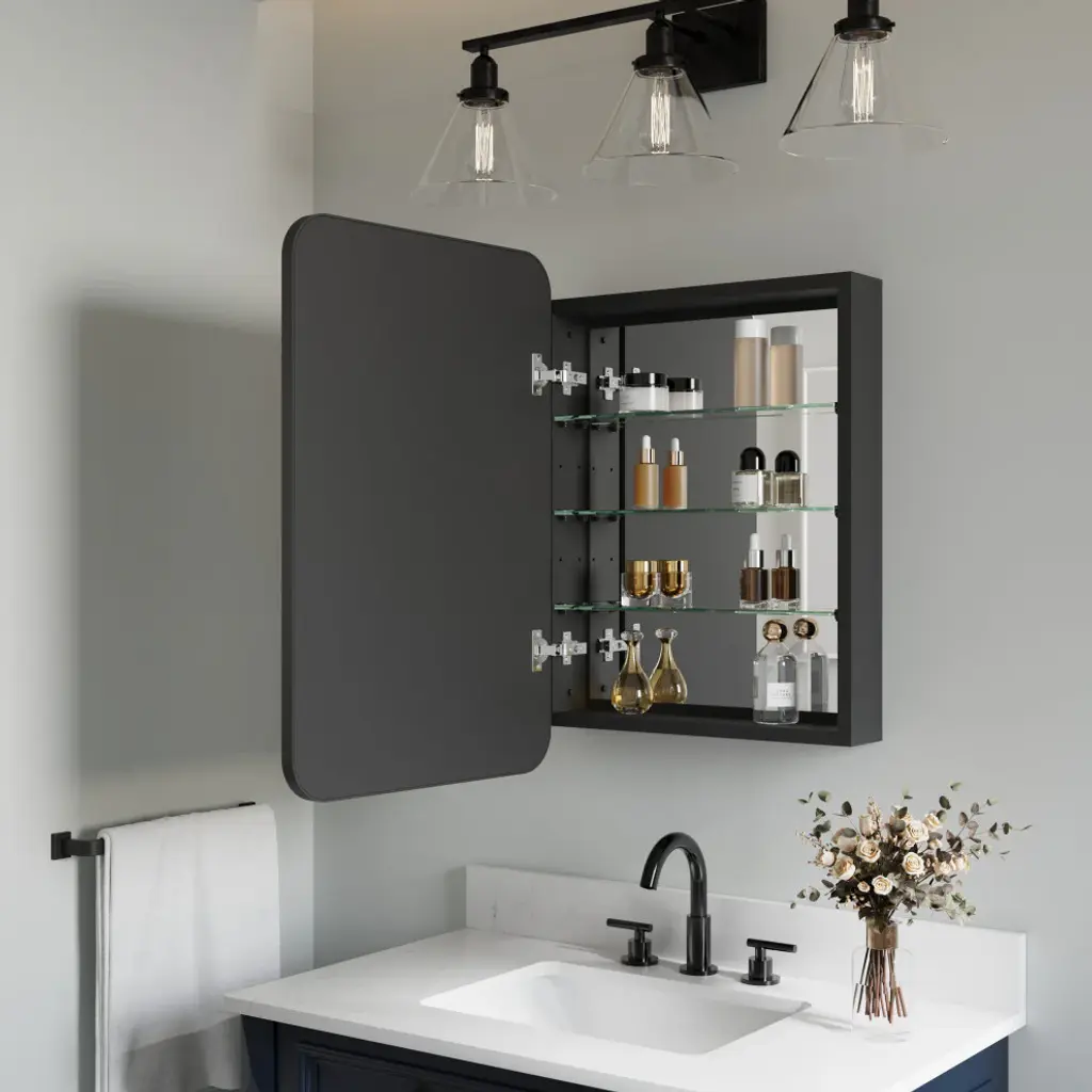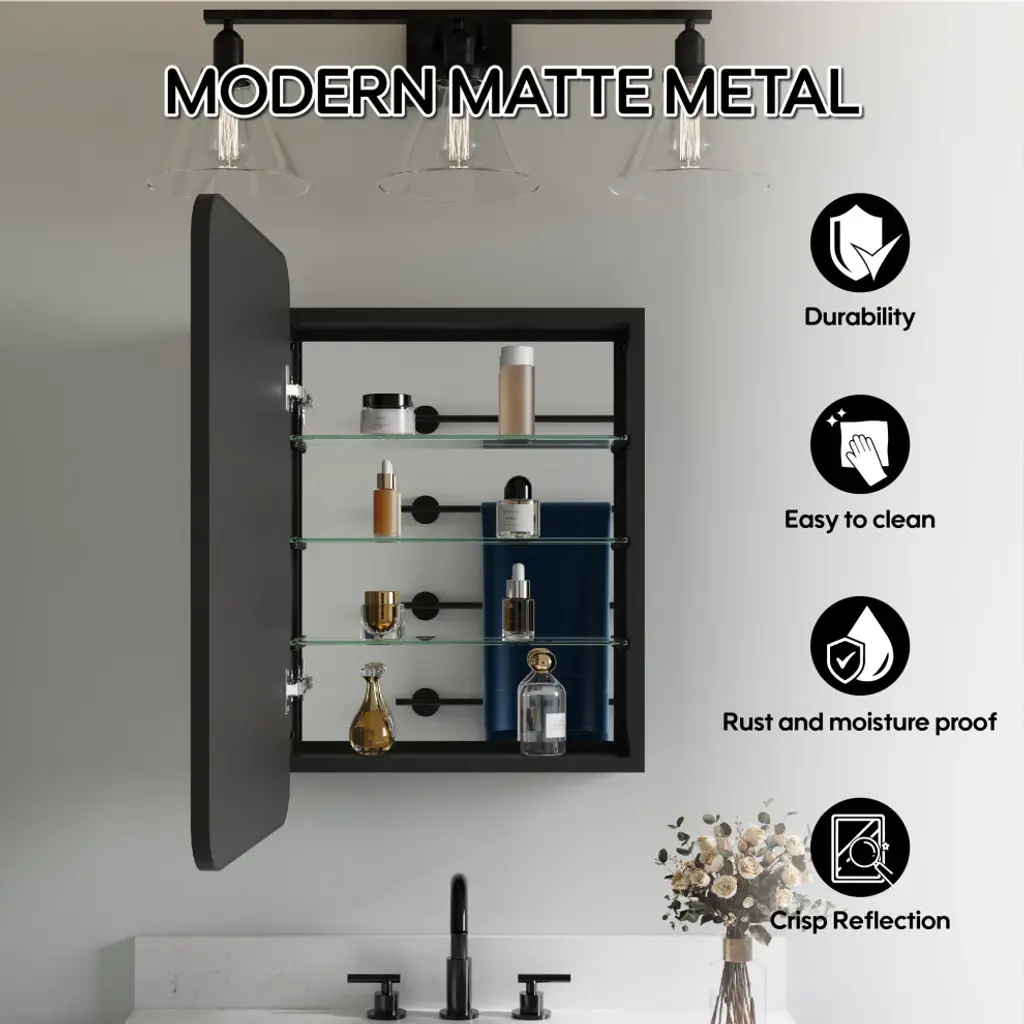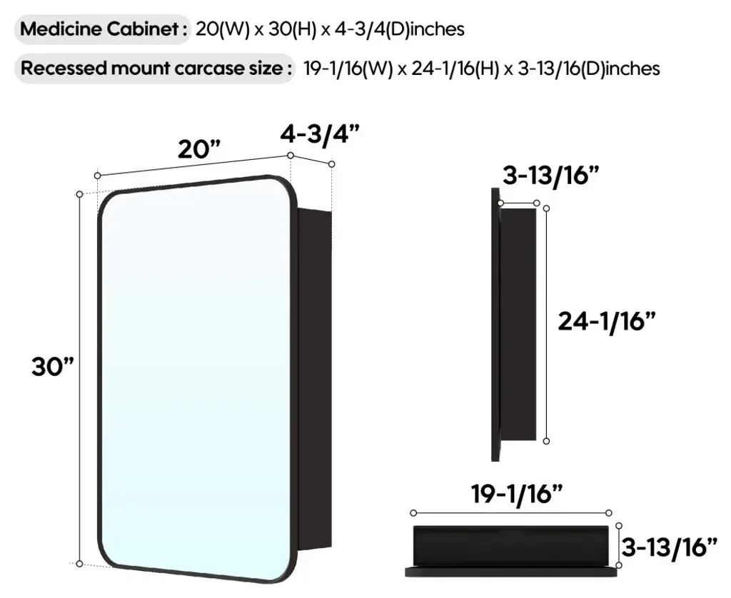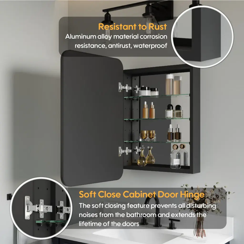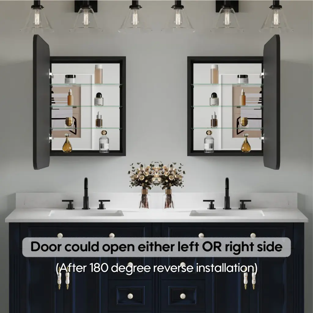 • • • Product Features: Premium Aluminum Alloy Frame: Crafted with corrosion-resistant, anti-rust, and waterproof aluminum alloy for long-lasting durability and a stylish look.Soft-Close Cabinet Door Hinge: Reduces noise and protects the cabinet door for prolonged use, ensuring a smooth and quiet bathroom experience.All-Glass Construction: Features a mirrored front panel, mirrored back panel inside the door, and a glass backing panel for a premium, seamless appearance.Explosion-Proof Glass Film: Ensures safety by preventing shattered glass from scattering in the event of impact.Dual Installation Options: Choose between wall-mounted or recessed installation to suit your bathroom layout and design preferences.Reversible Door Design: The door can be installed to open left or right by reversing its 180-degree orientation, offering flexibility for different spaces.Tempered Adjustable Glass Shelves: Sturdy and adjustable shelves allow you to customize storage for toiletries and personal items with ease.Fully Assembled: Ready to install right out of the box, saving you time and effort.• • • Specifications:Material: Aluminum alloy frame with tempered glass panelsShelves: Adjustable tempered glassInstallation Options: Wall-hanging or recessedDimensions: 20" x 30" x 4-3/4"Rough-in Size: 19-1/16" x 24-1/16" x 3-13/16"Finish: Black